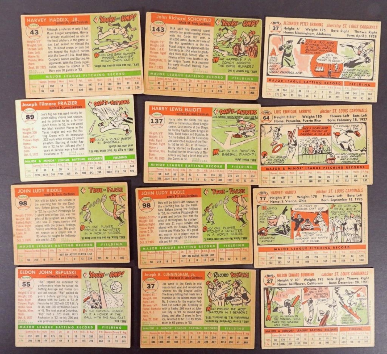 12-1955- TOPPS- CARDINALS- HARVEY HADDIX (PITCHER), JOE FRAZIER (OUTFIELD), JOHNNY RIDDLE (COACH). ALL OF THESE CARDS ARE VG/GOOD CONDITION. PREOWNED.