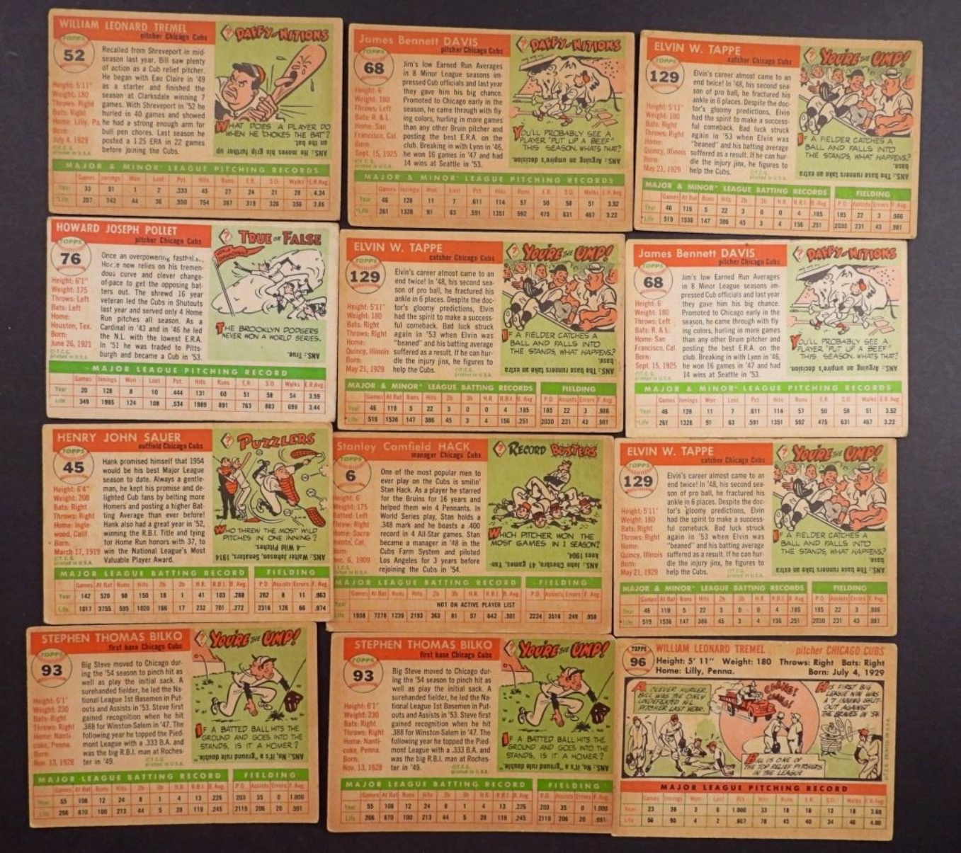 12-1955-TOPPS-CHICAGO CUBS- BILL TREMEL (PITCHER), HOWIE POLLET (PITCHER), HANK SAUER (OUTFIELD). ALL OF THESE CARDS ARE IN VG/GOOD CONDITION. PREOWNED.