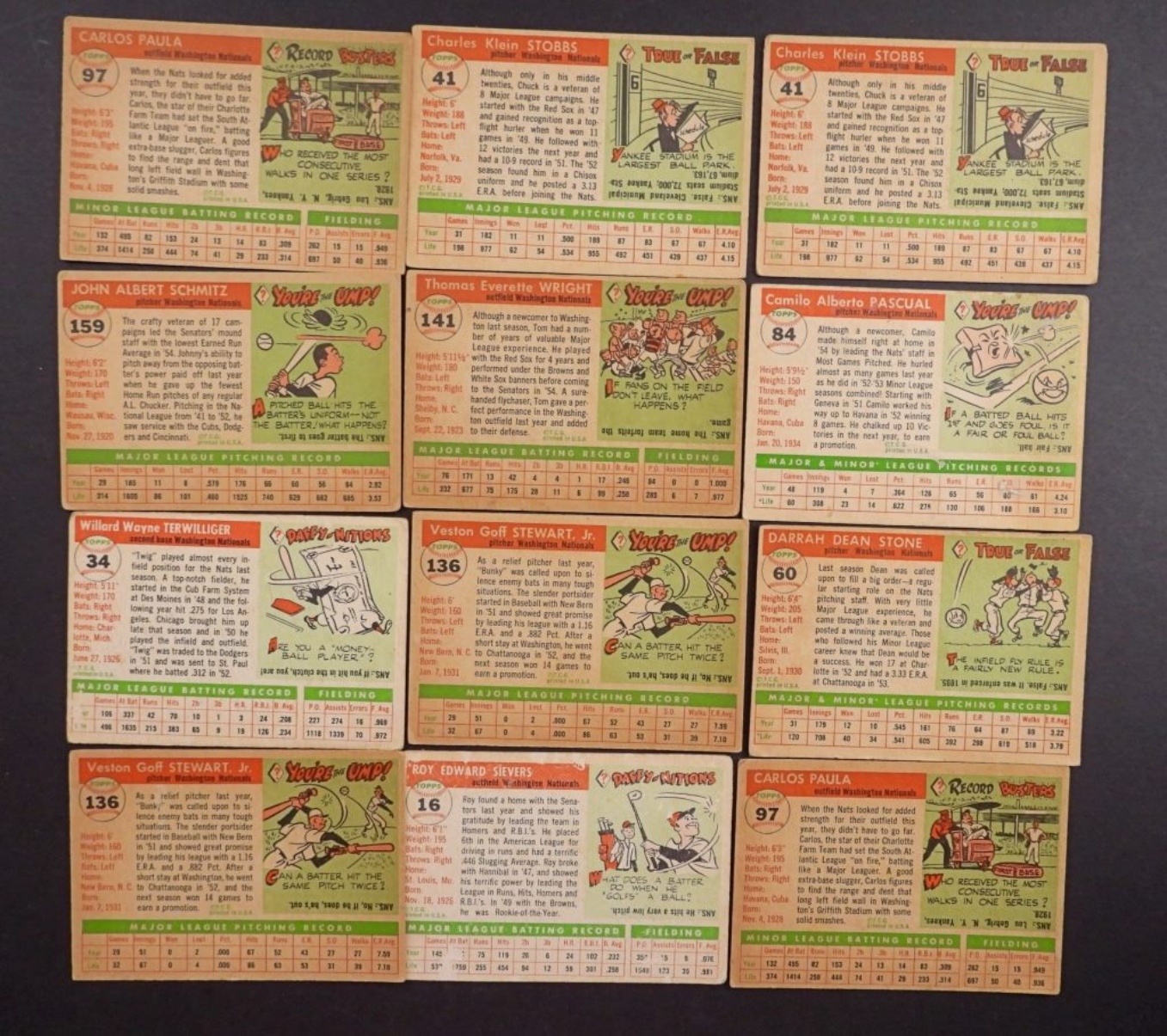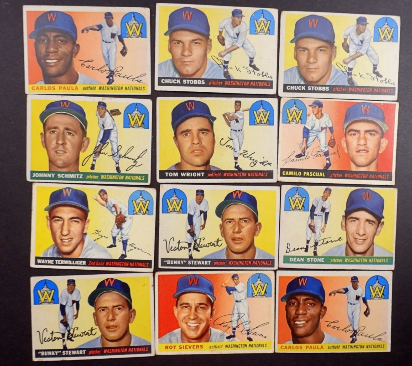 12-1955-TOPPS-WASHINGTON NATIONALS- CARLOS PAULA (PITCHER), JOHNNY SCHMITZ (PITCHER), WAYNE TERWILLIGER (2ND BASE). ALL OF THESE CARDS ARE IN VG/GOOD CONDITION. PREOWNED.