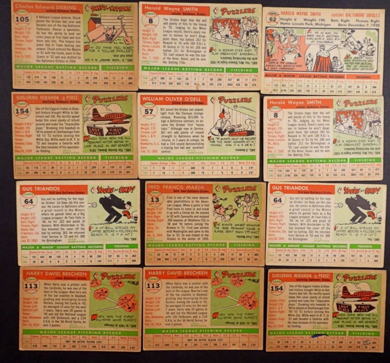 12-1955-TOPPS-BALTIMORE ORIOLES- CHUCK DIERING (OUTFIELD), WILLIE MIRANDA (SHORTSTOP), GUS TRIANDOS (1ST BASE). ALL OF THESE CARDS ARE IN VG/GOOD CONDITION. PREOWNED.