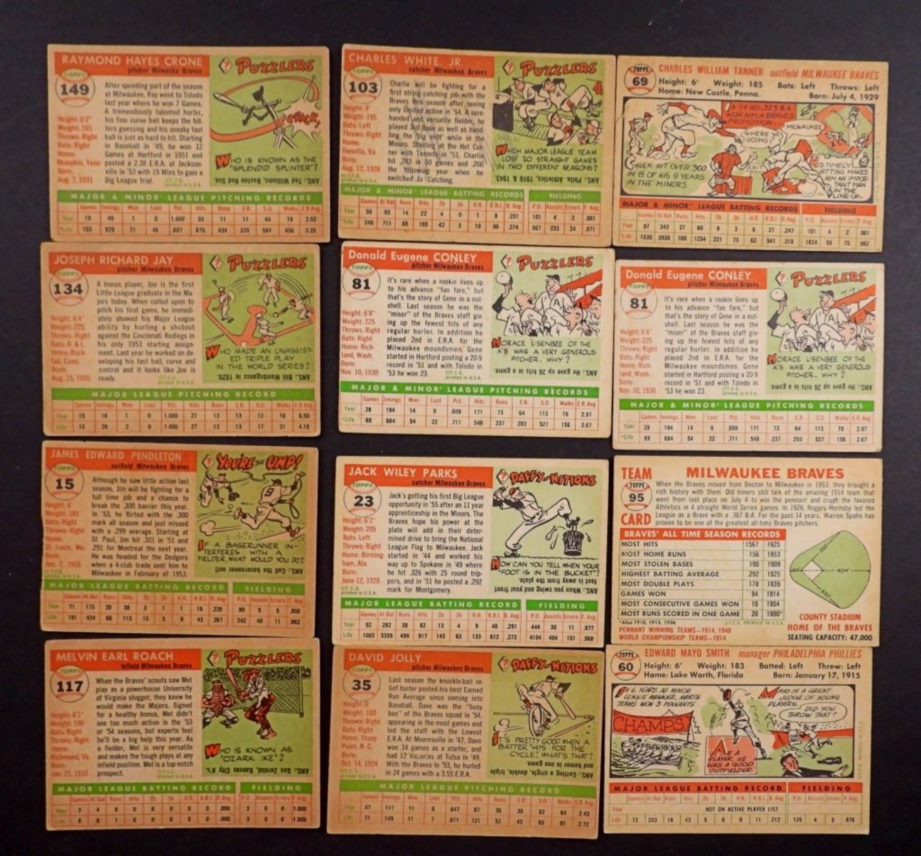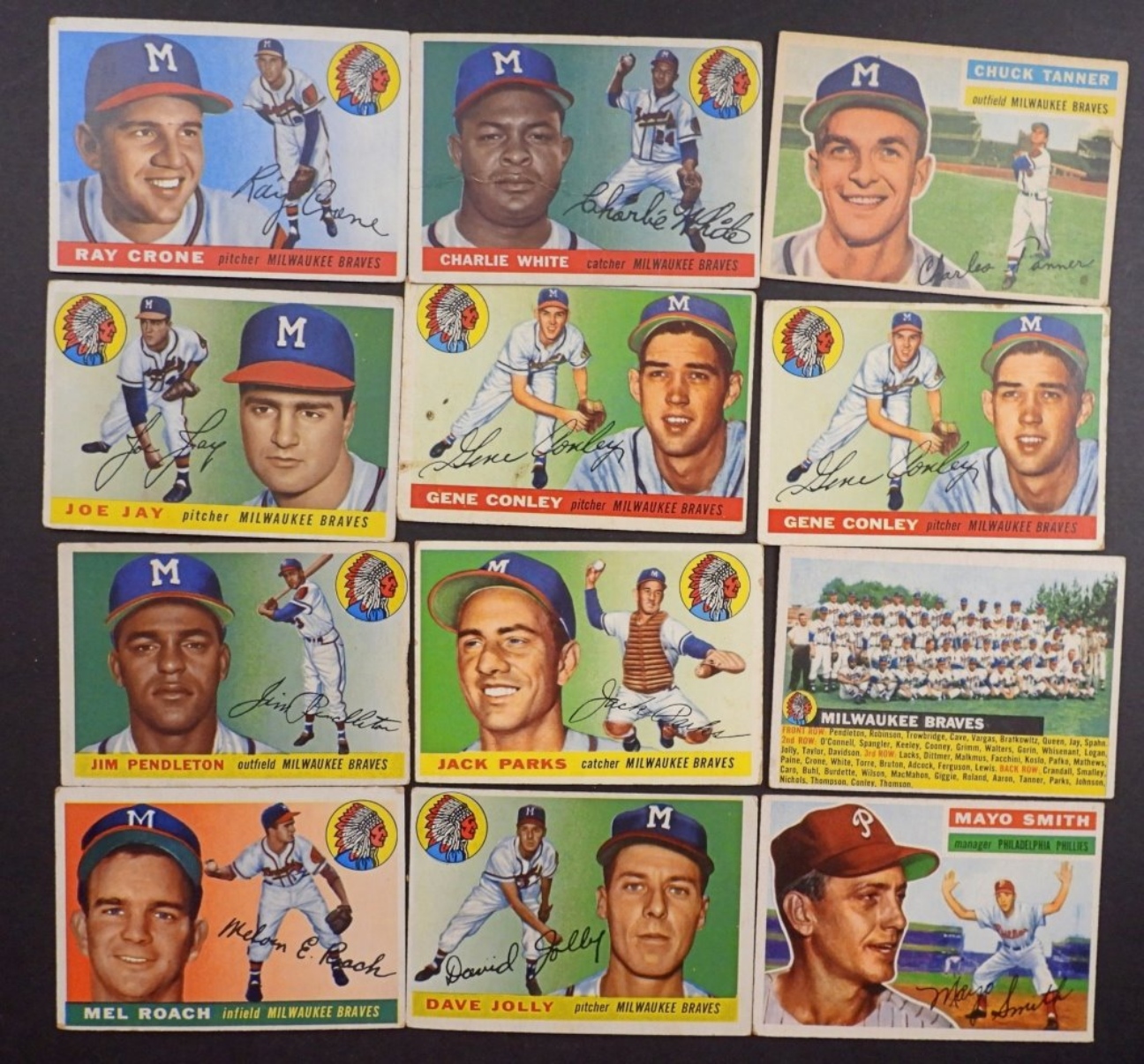 12-1955 TOPPS-MILWAUKEE BRAVES- RAY CRONE (PITCHER), JOE JAY (PITCHER), JIM PENDLETON (OUTFIELD). ALL OF THESE CARDS ARE VG/GOOD OR BETTER CONDITION. PREOWNED.