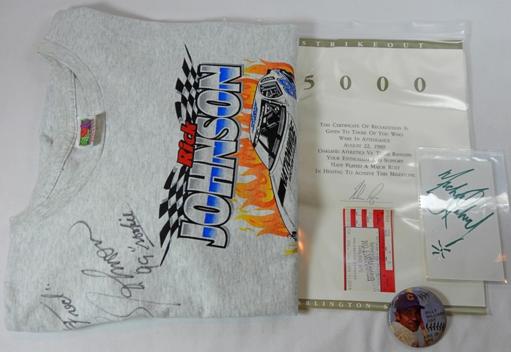 NEW , RICK JOHNSON SIGNED “TO FRED” T-SHIRT RACING, COLTS MEMORABILIA FACSIMILE SIGNED BALL in BOX, NOLAN RYAN 1989 ARLINGTON STADIUM TICKET, UNIDENTIFIED CUT SIGNATURE on 3×5