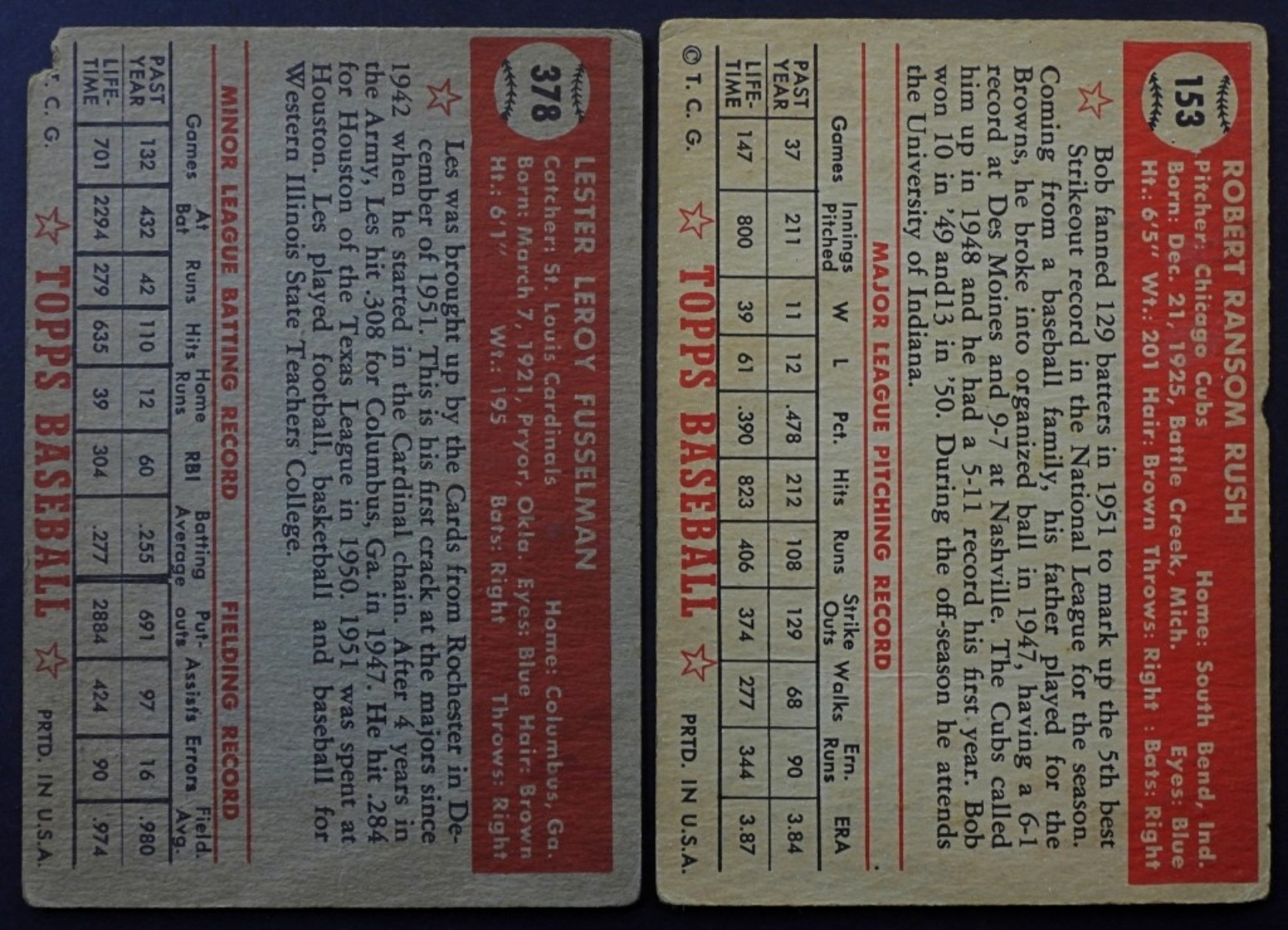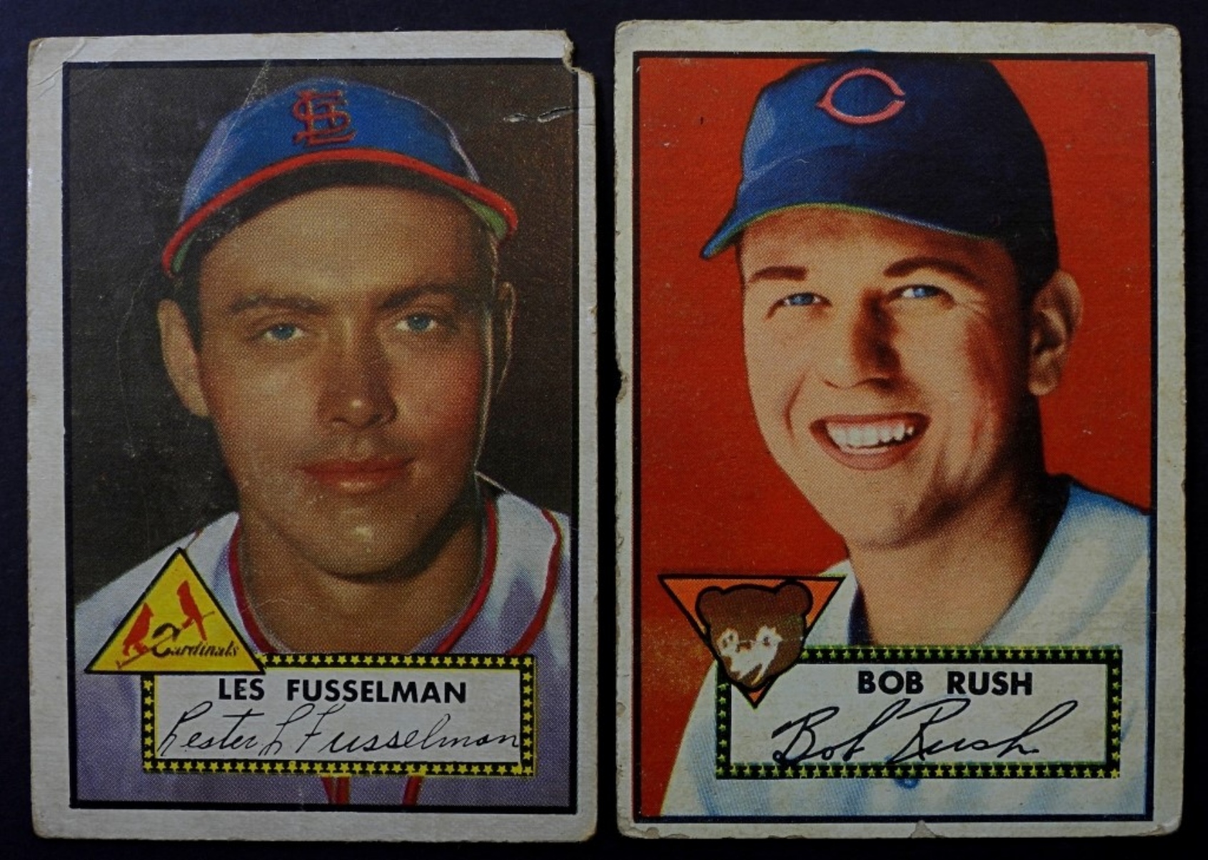 2-1952-TOPPS- ST. LOUIS CARDINALS- LES FUSSELMAN. 1952-TOPPS- CHICAGO CUBS- BOB RUSH. THESE CARDS ARE IN FAIR TO GOOD CONDITION. THEY DO SHOW SOME WEAR. PREOWNED.