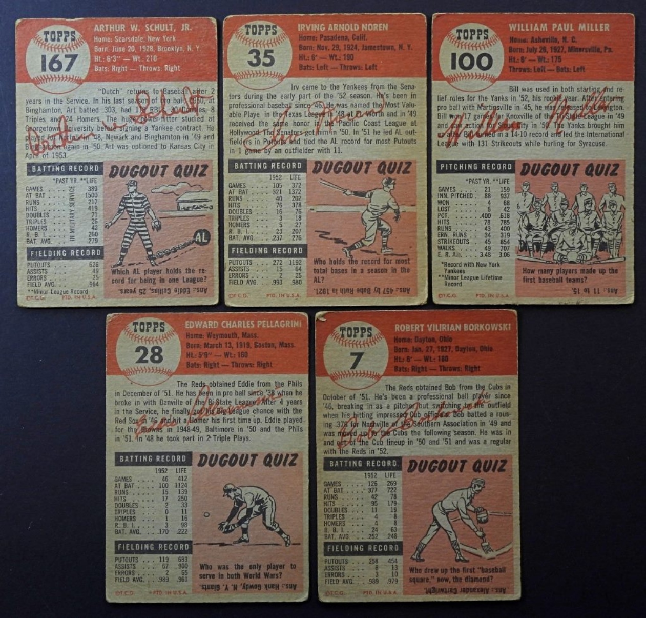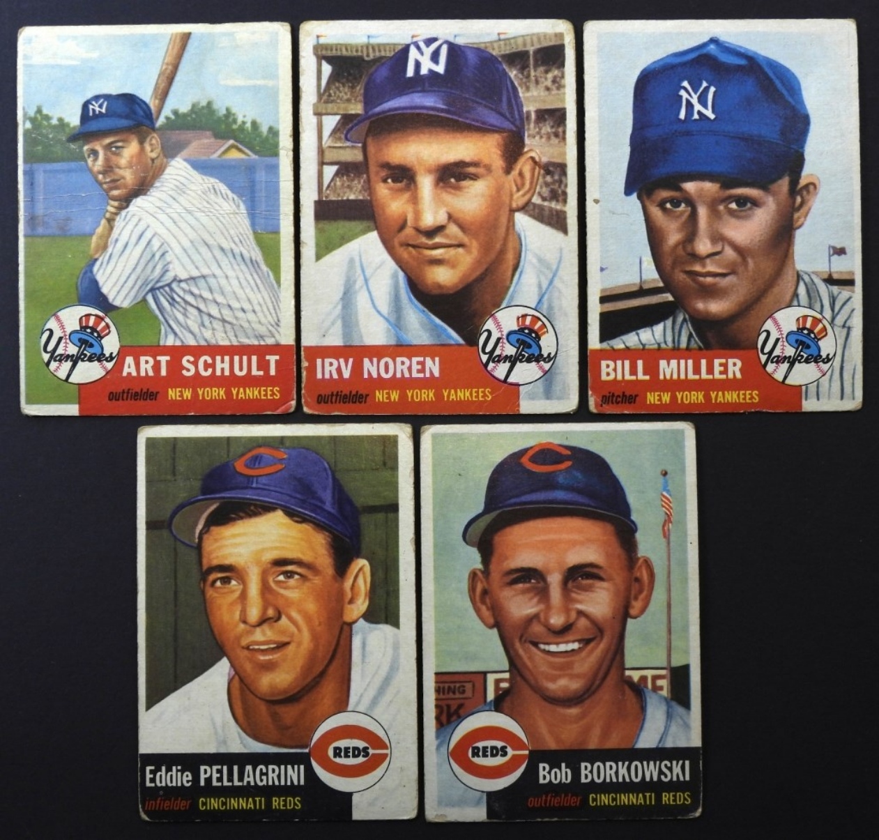 3-1953-TOPPS-NEW YORK YANKEES-EDDIE PELLAGRINI (INFIELDER), ART SCHULT (OUTFIELDER), IRV NOREN (OUTFIELDER), BILL MILLER (PITCHER), BOB BORKOWSKI (OUTFIELDER). ALL OF THESE CARDS ARE IN FAIR TO GOOD