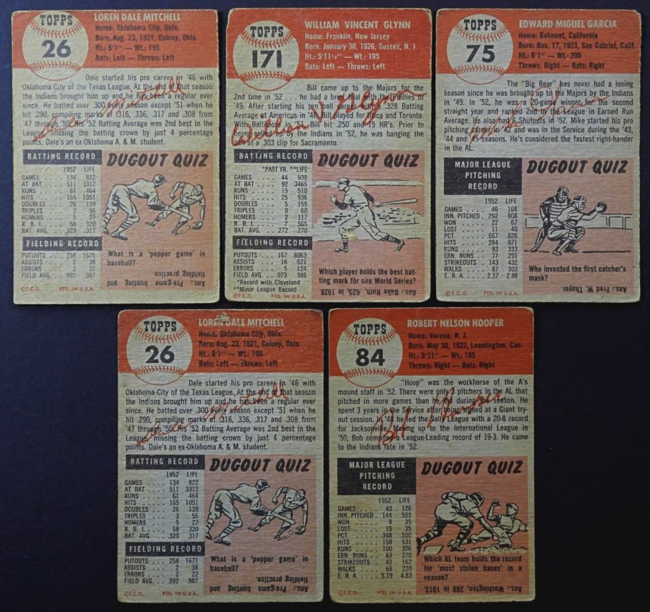 5-1953-TOPPS-CLEVELAND INDIANS- BOB HOOPER (PITCHER), MIKE GARCIA (PITCHER), DALE MITCHELL (OUTFIELDER), BILL GLYNN (FIRST BASE), DAVE MITCHELL (OUTFIELDER). ALL OF THESE CARDS ARE IN FAIR TO GOOD CONDITION.