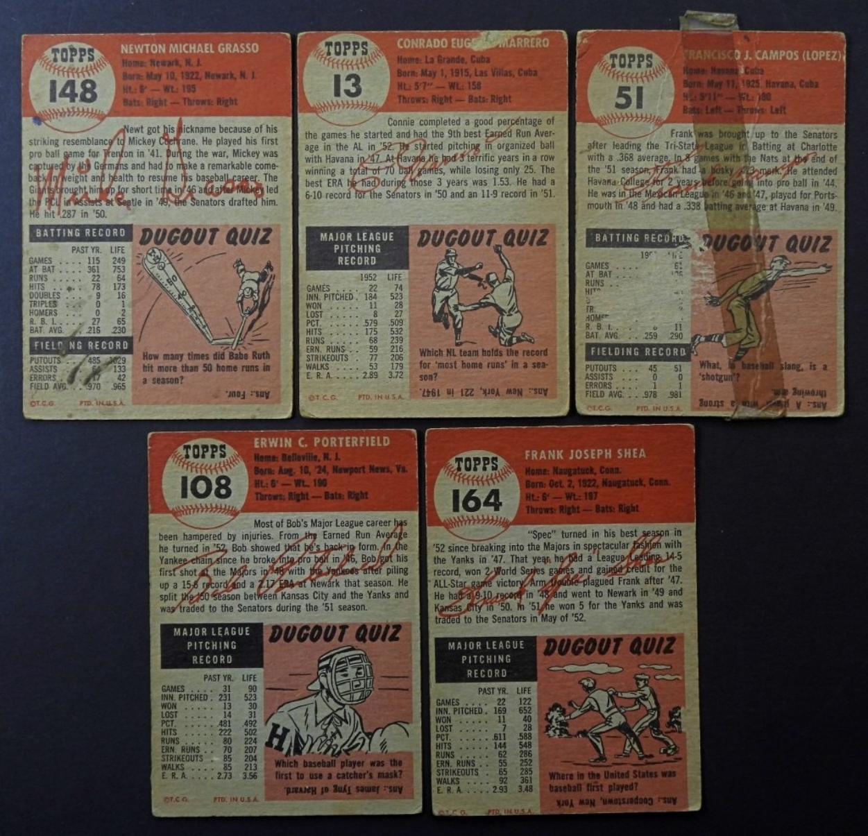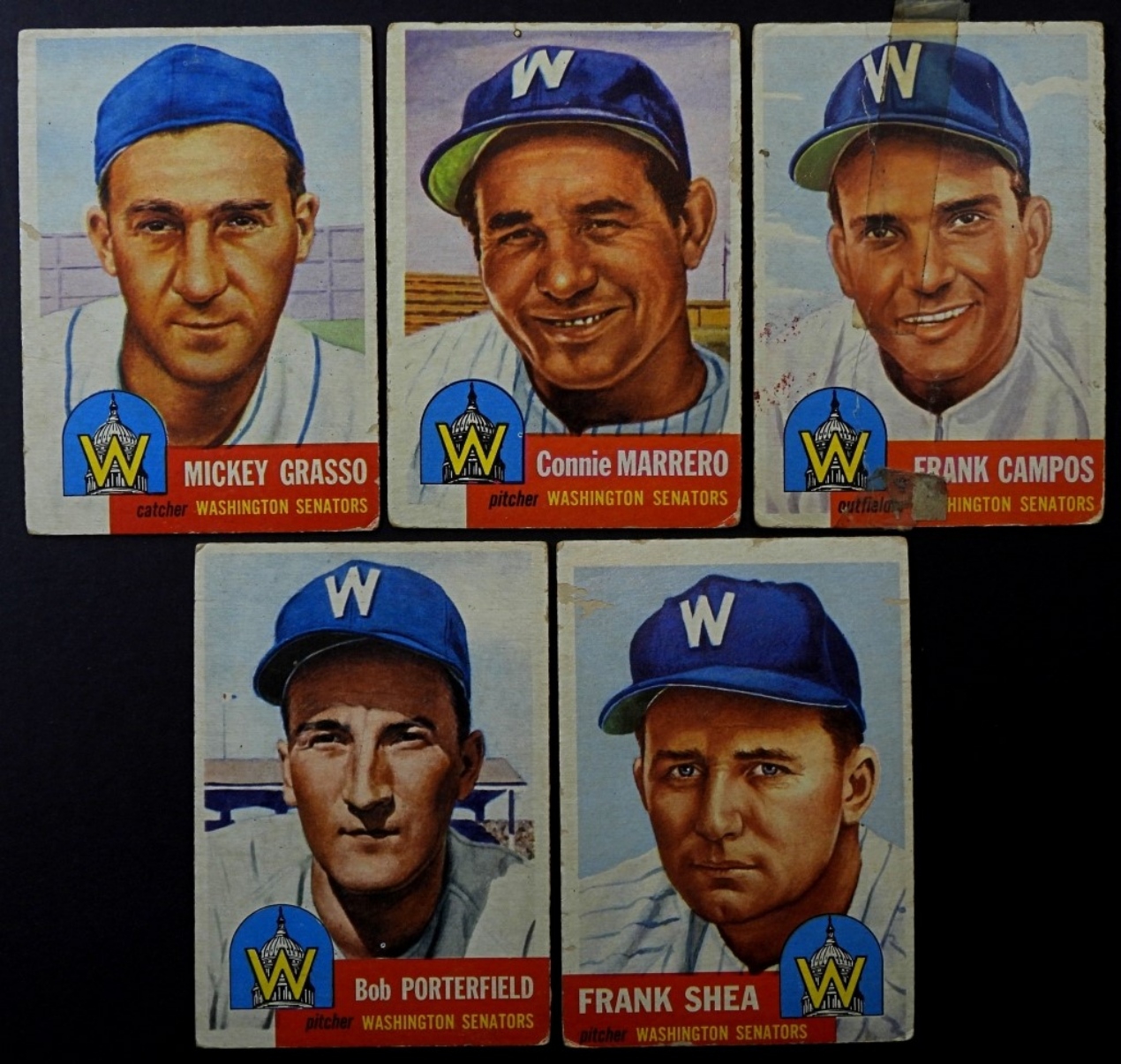 5-1953-TOPPS-WASHINTON SENATORS- MICKEY GRASSO (CATCHER), CONNIE MARRERO (PITCHER), FRANK SHEA (PITCHER), FRANK CAMPOS (OUTFIELDER). ALL OF THESE CARDS ARE IN FAIR TO GOOD CONDITION. THESE CARDS DO SHOW SOME