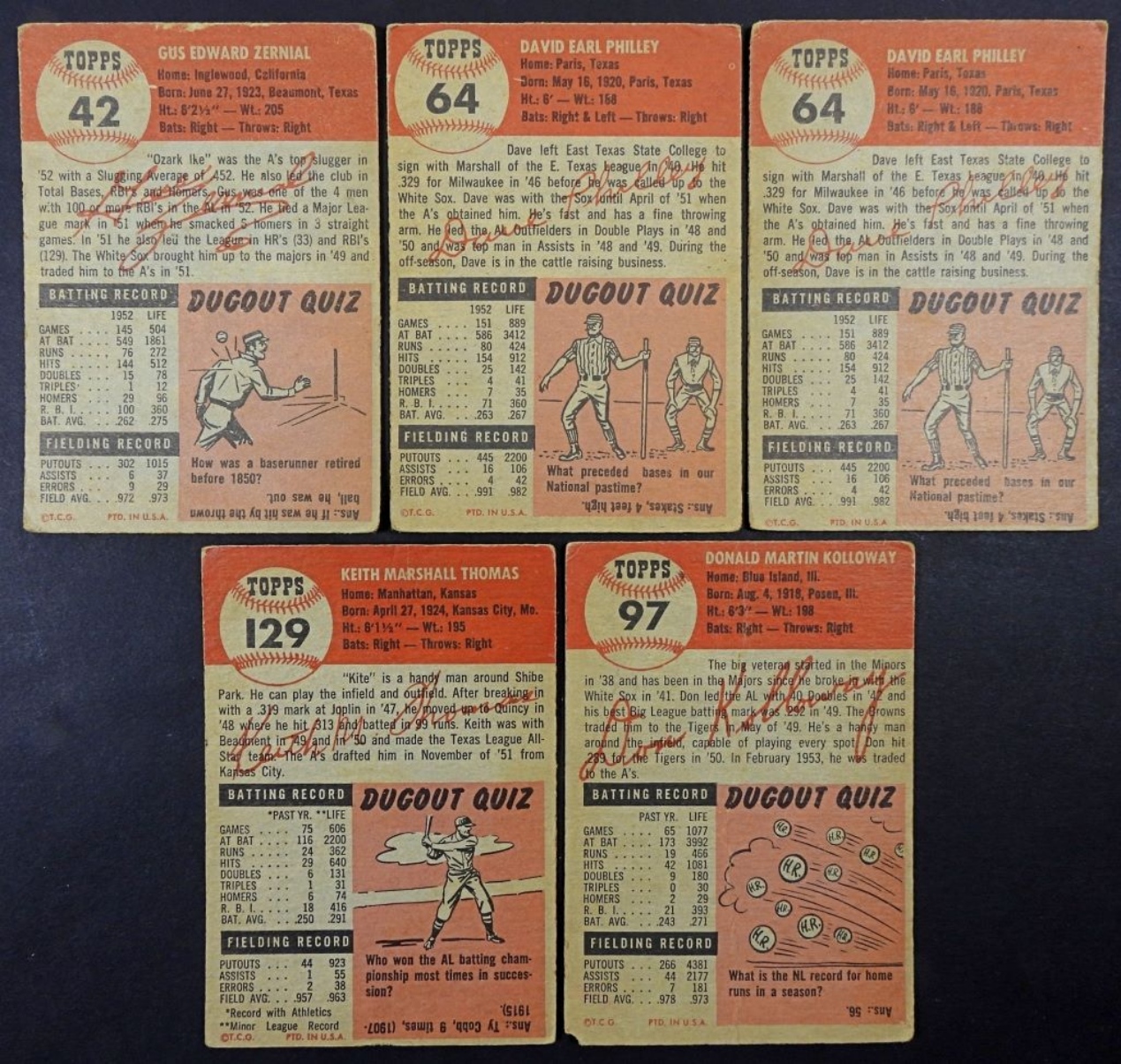 5-1953-TOPPS-PHILADELPHIA ATHELTICS- DAVE PHILLEY (OUTFIELDER), DON KOLLOWAY (INFIELDER), KEITH THOMAS (OUTFIELDER), DAVE PHILLEY (OUTFIELDER). ALL OF THESE CARDS ARE IN FAIR TO GOOD CONDITION. THEY DO SHOW