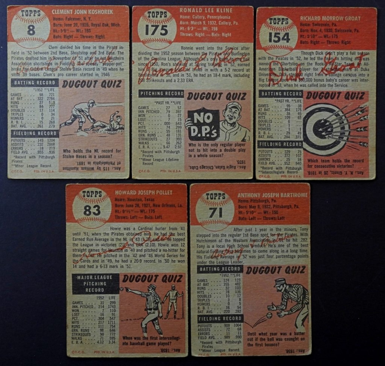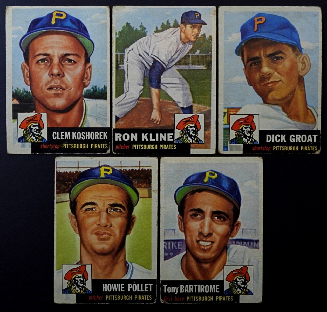 5-1953-TOPPS-PITTSBURG PIRATES- CLEM KOSHOREK (SHORTSTOP), RON KLINE (PITCHER), DICK GROAT (SHORTSTOP), TONY BARTIROME (FIRST BASE), HOWIE POLLET (PITCHER). ALL OF THESE CARDS ARE IN FAIR TO GOOD CONDITION. THESE CARDS DO