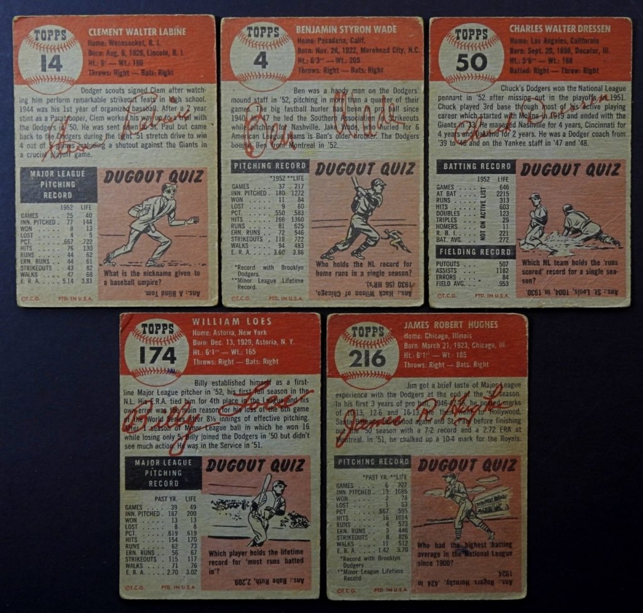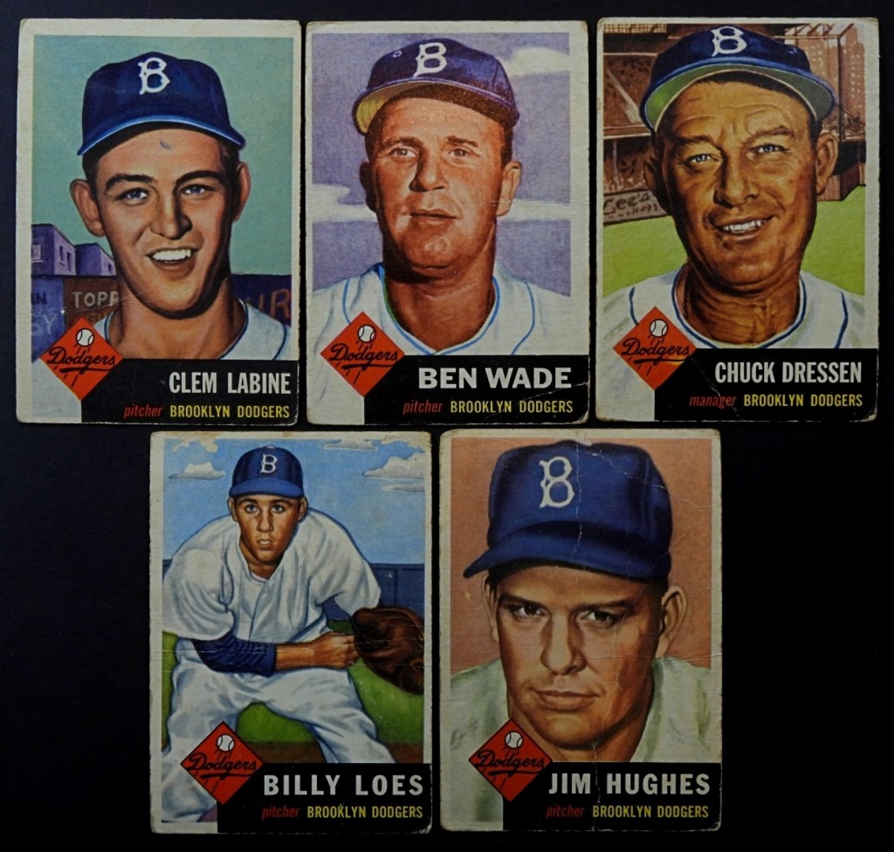 5-1953-TOPPS-BROOKLYN DODGER- CLEM LABINE (PITCHER), CHUCK DRESSEN MANAGER), BEN WADE (PITCHER),JIM HUGHES (PITCHER), BILLY LOES (PITCHER). ALL OF THESE CARDS ARE IN FAIR TO GOOD CONDITION. THEY DO SHOW SOME WEAR.