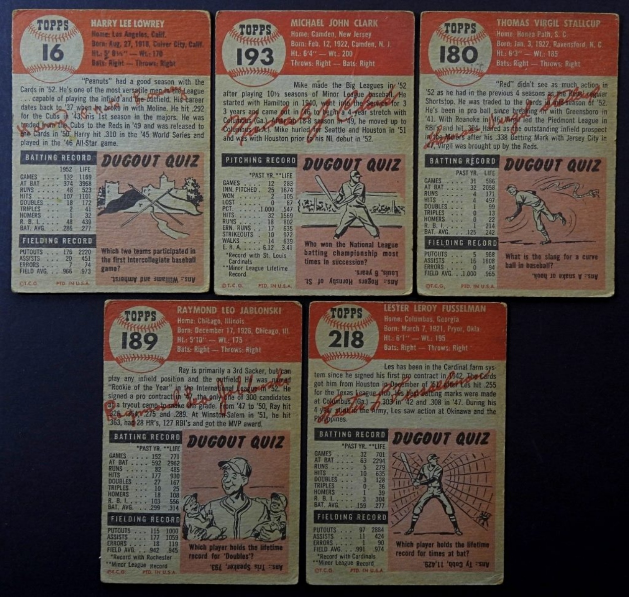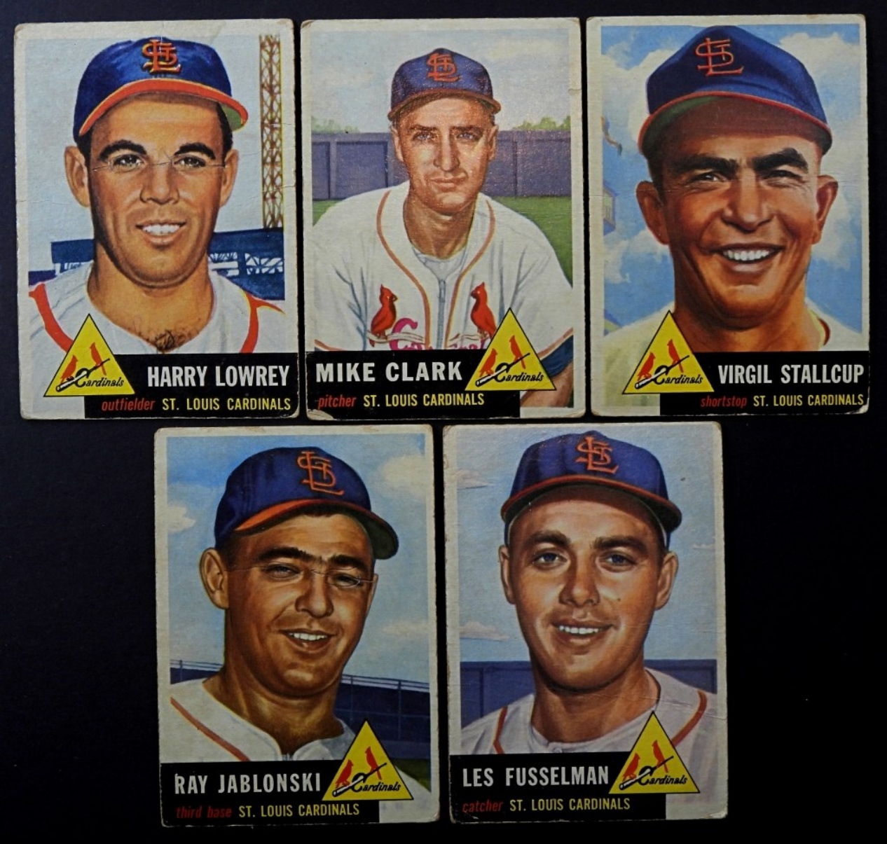 5-1953-TOPPS-ST. LOUIS CARDINALS- HARRY LOWREY (OUTFIELDER), MIKE CLARK (PITCHER), VIRGIL STALLCUP (SHORTSTOP), LES FUSSELMAN (CATCHER), RAY JABLONSKI (THIRD BASE). ALL OF THESE CARDS ARE IN FAIR TO GOOD CONDITION.