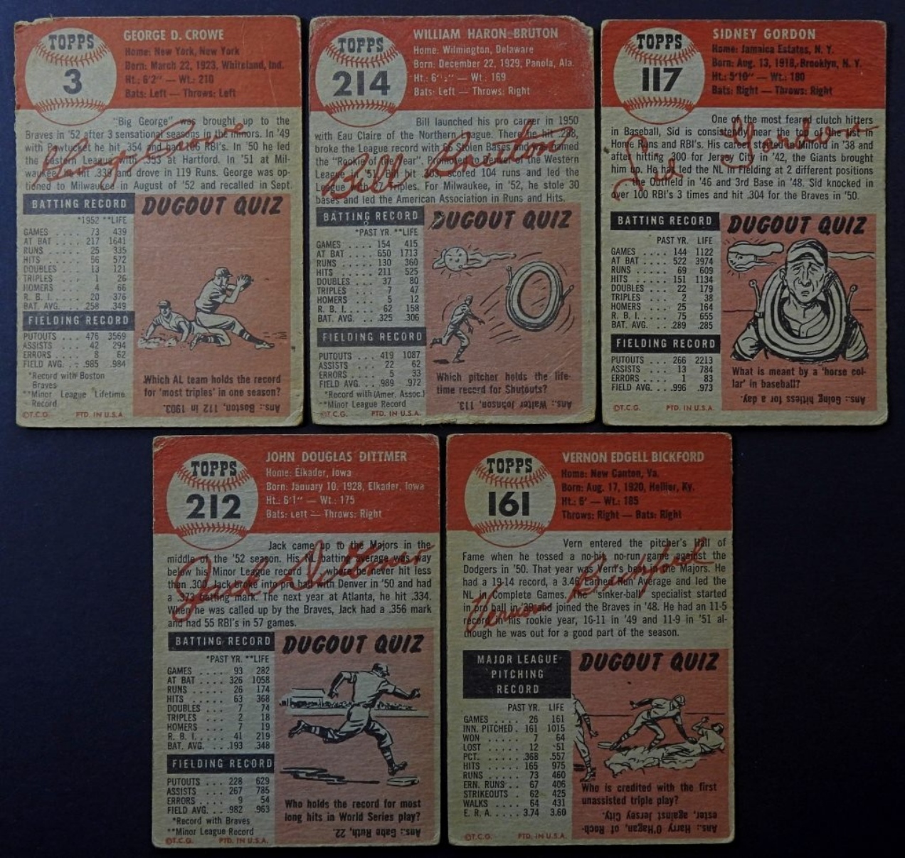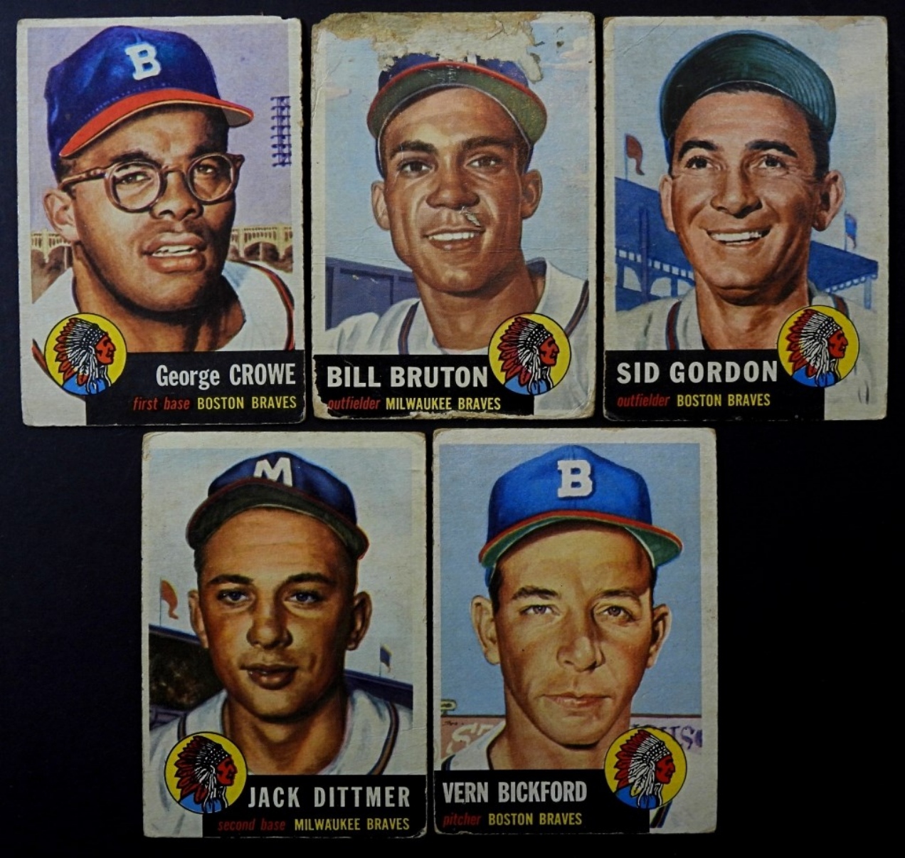 5-1953-TOPPS-BOSTON BRAVES- GEROGE CROWE (FIRST BASE), BILL BRUTON (OUTFIELDER), SID GORDON (OUTFIELDER), VERN BICKFORD (PITCHER), JACK DITTMER (SECOND BASE). ALL OF THESE CARDS ARE IN FAIR TO GOOD CONDITION.