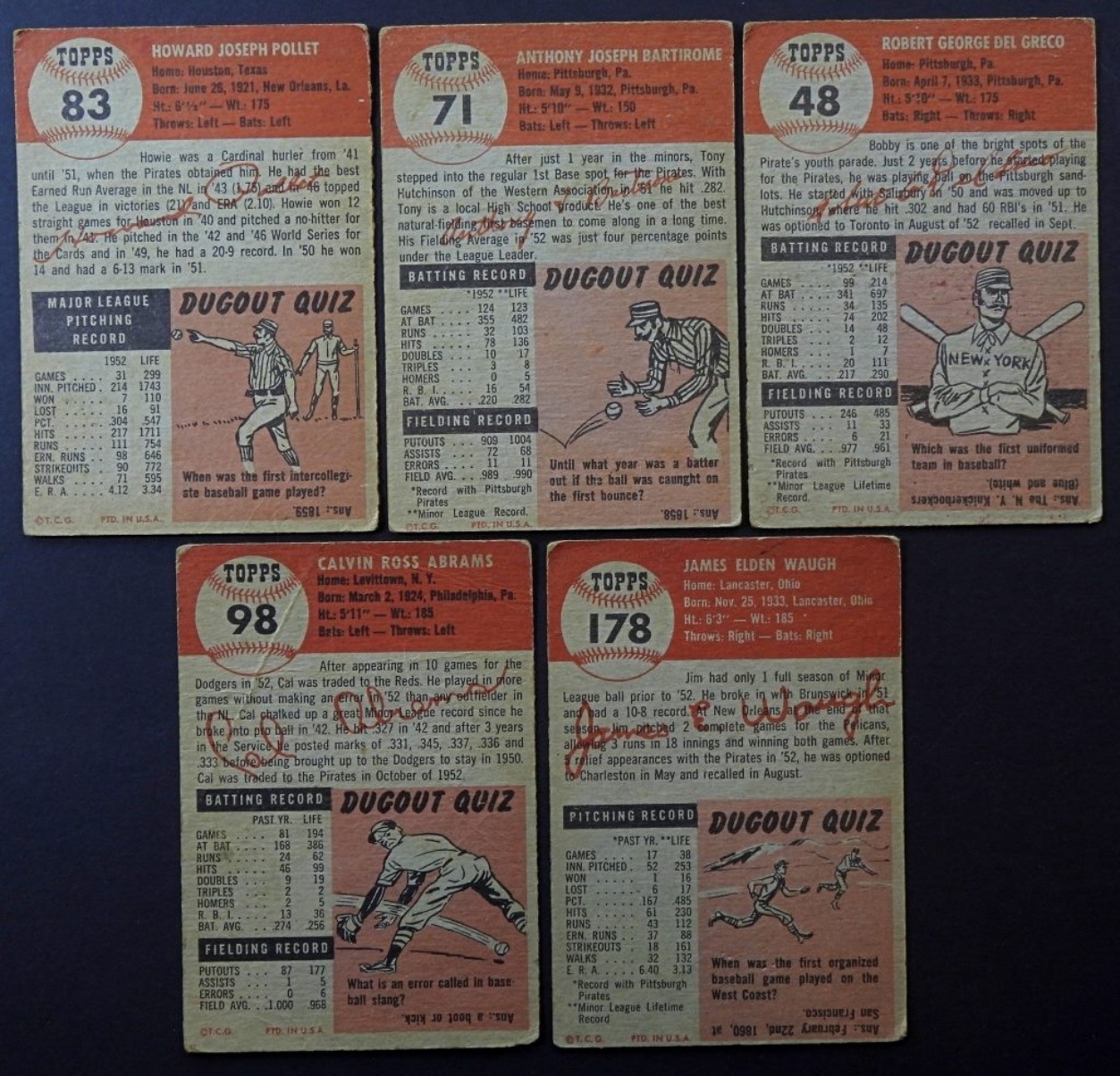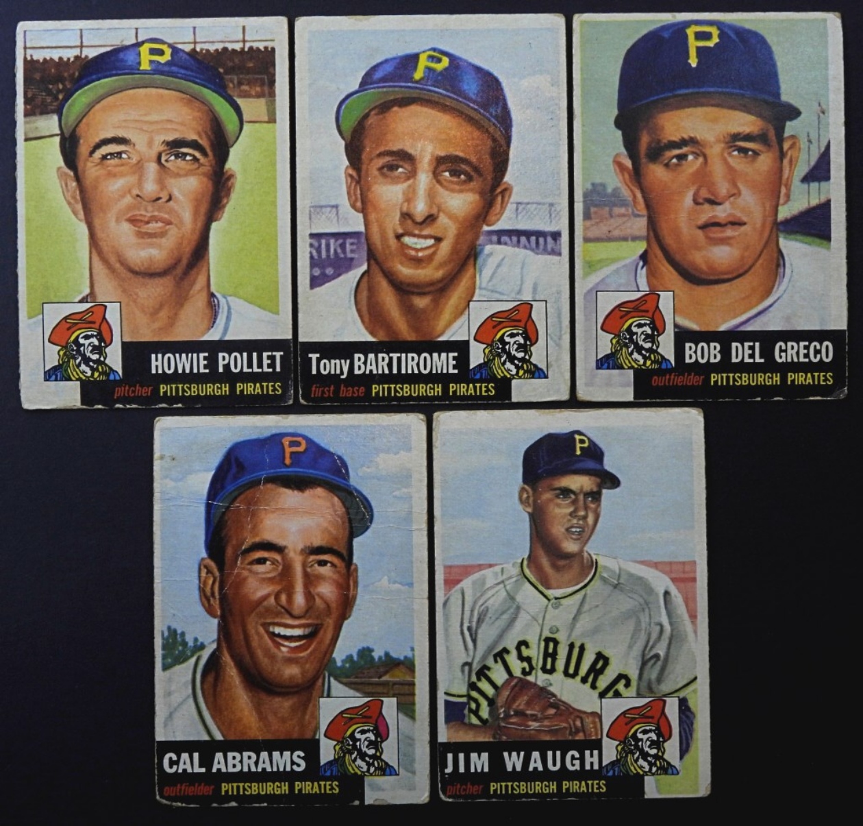 5-1953-PITTSBURGH PIRATES- HOWIE POLLET (PITCHER), TONY BARTIROME (FIRST BASE), BOB DEL GRECO (OUTFIELDER), JIM WAUGH (PITCHER), CAL ABRAMS (OUTFIELDER). ALL OF THESE CARDS ARE IN FAIR TO GOOD CONDITION. THEY DO SHOW