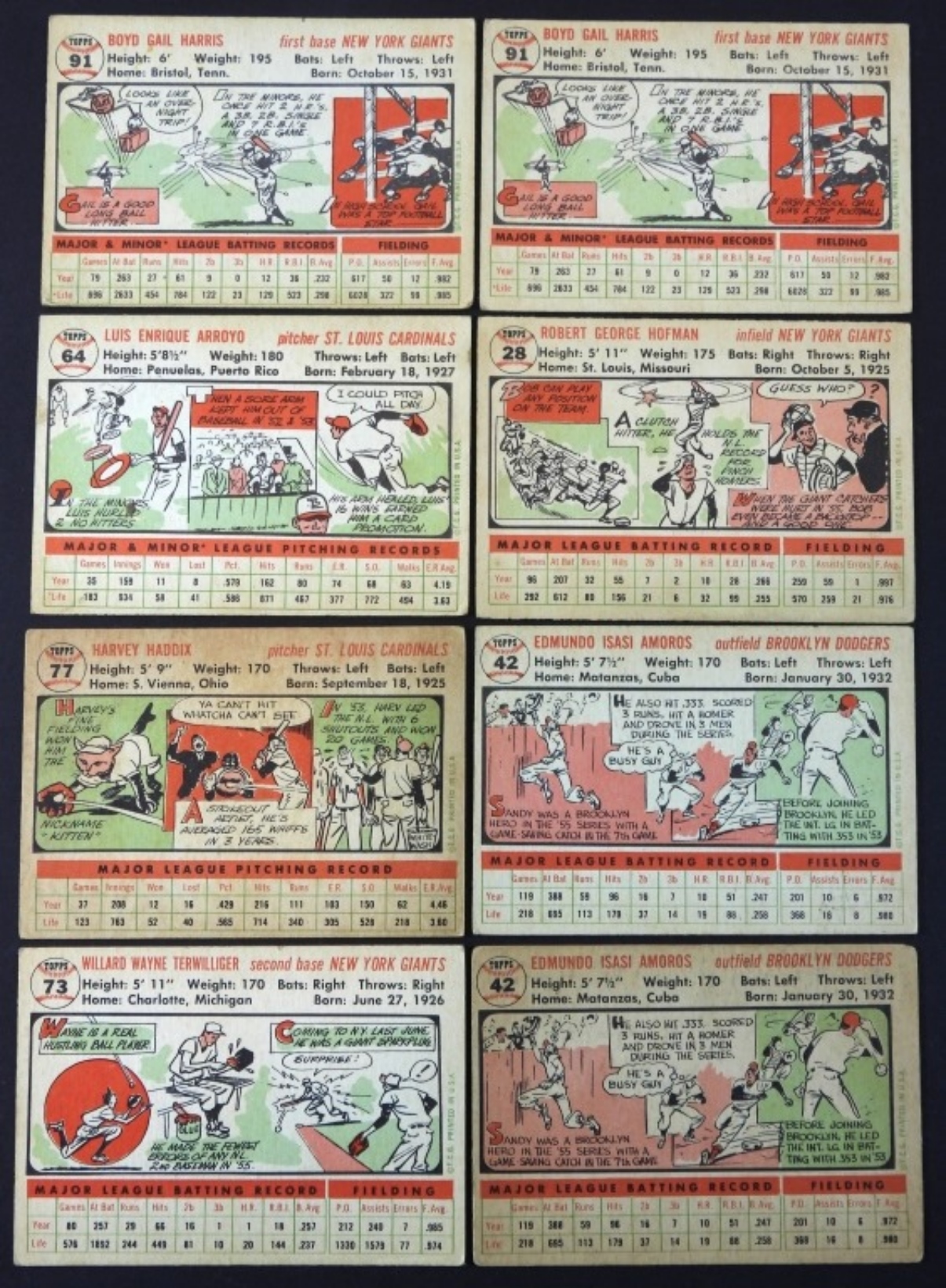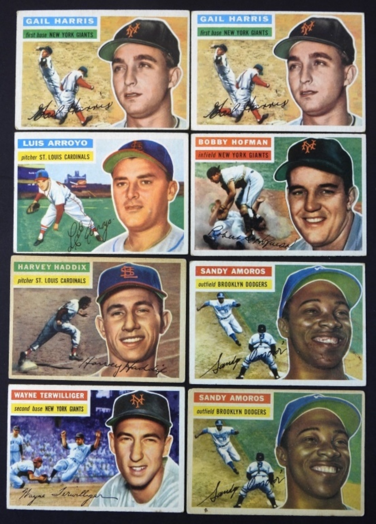8-1956 TOPPS ASSORTED TEAMS & PLAYERS- LUIS ARROYO (PITCHER), HARVEY HADDIX (PITCHER), WAYNE TERWILLIGER (SECOND BASE), 2-GAIL HARRIS (FIRST BASE), BOBBY HOFMAN (INFIELD), 2- SANDY AMOROS (OUTFIELD) VG/GOOD