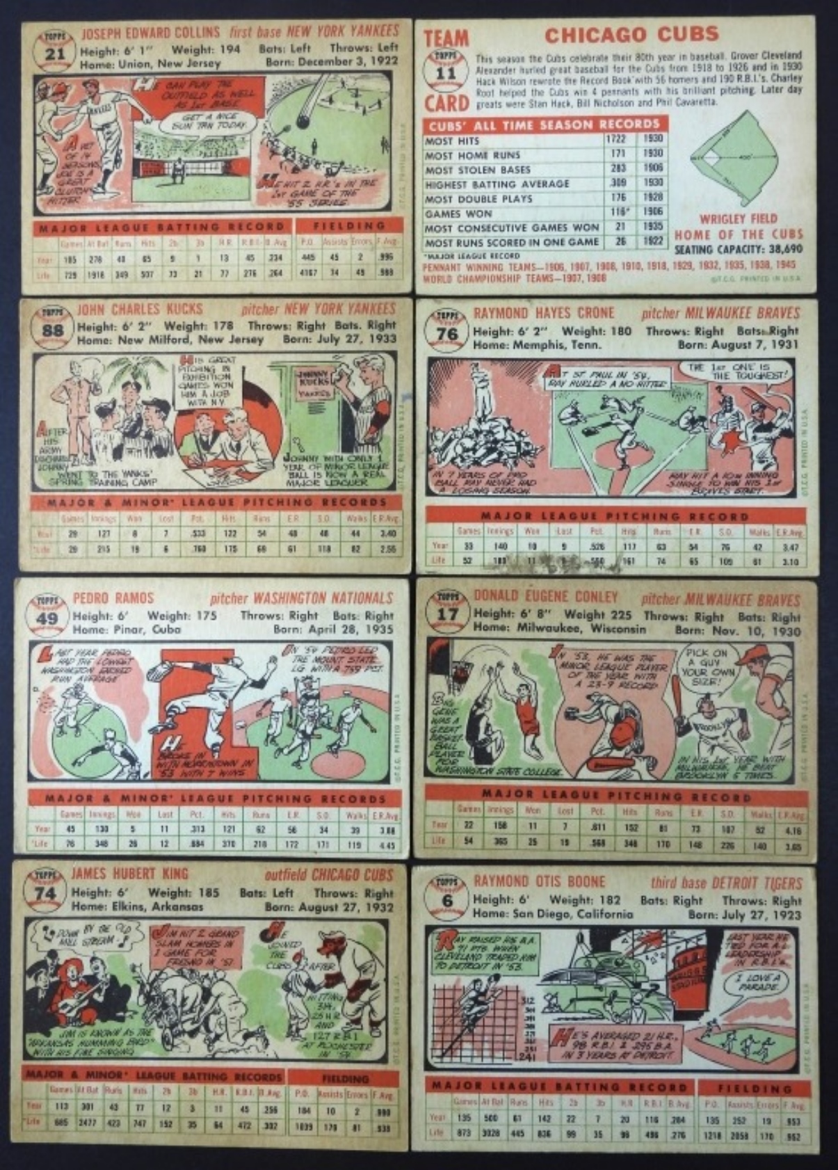 8-1956 TOPPS- ASSORTED TEAMS & PLAYERS- JOE COLLINS (FIRST BASE), JOHNNY KUCKS ( PITCHER), PEDRO RAMOS ( PITCHER), JIM KING (OUTFIELD), CHICAGO CUBS (TEAM), RAY CRONE (PITCHER), GENE CONLEY (PITCHER), RAY BOONE