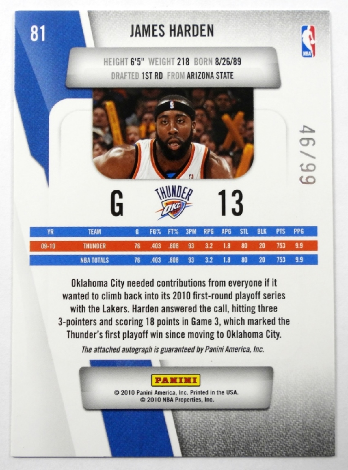 2010-11 PANINI #81 JAMES HARDEN SIGNED CARD,