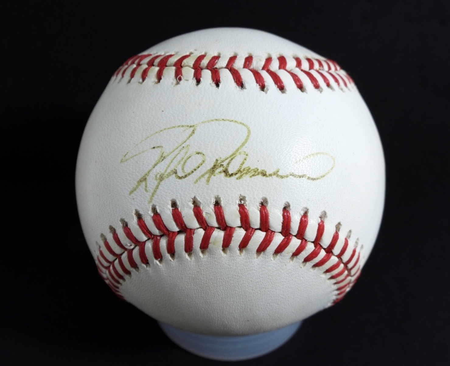 OFFICIAL AMERICAN LEAGUE AUTOGRAPHED BASEBALL BY RAFAEL PALMEIRO WITH JSA COA- IN GOOD CONDITION- PREOWNED.