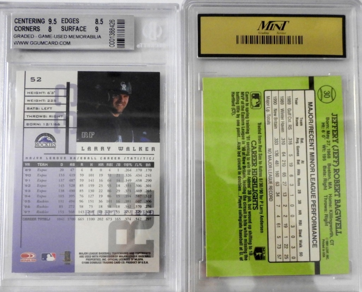 1998 LEAF LARRY WALKER with GAME USED INSERT BECKETT 8.5 & 1991 DONRUSS BAGWELL MINT 10