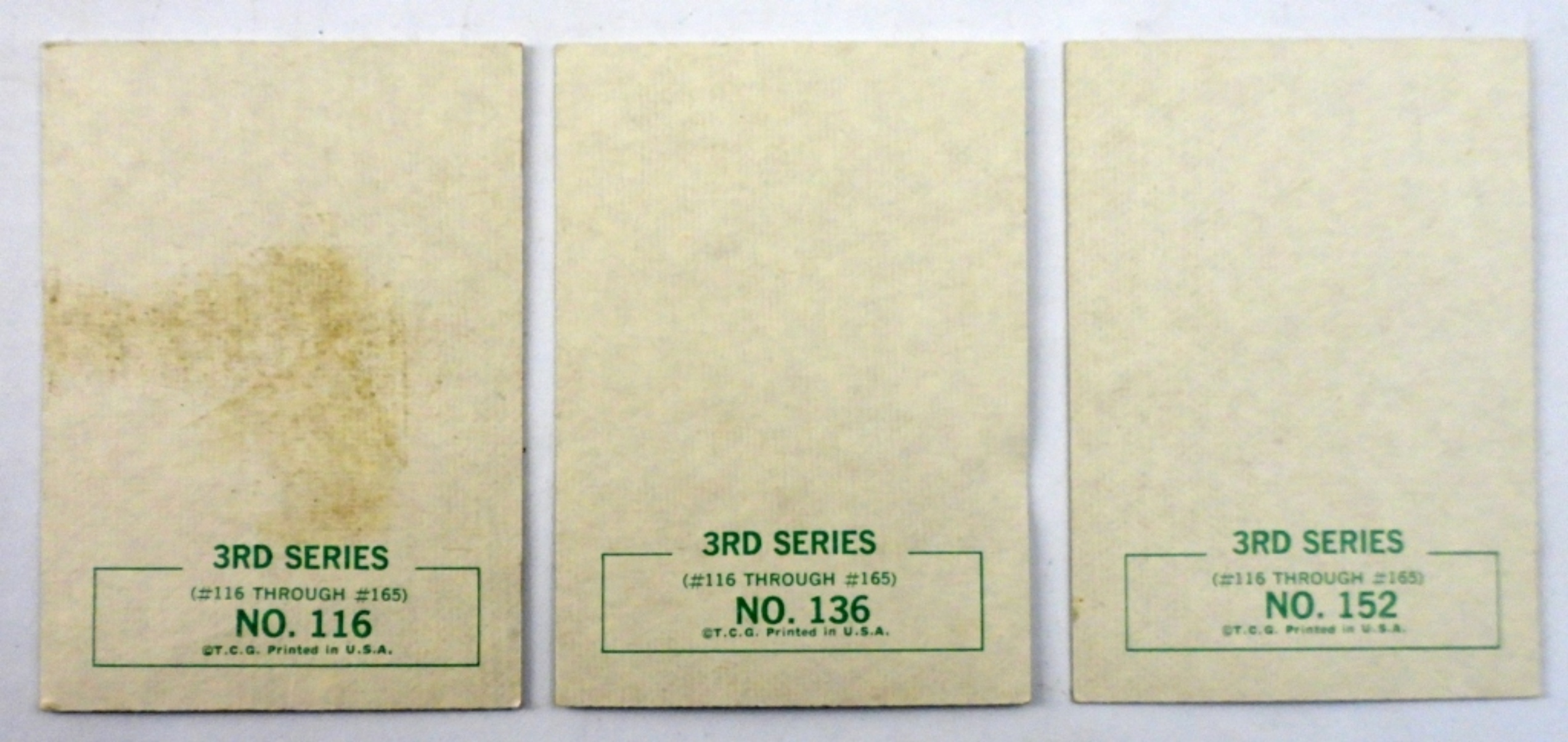 3 – 1964 TOPPS 3RD SERIES BEATLES TRADING CARDS, #116, #136, #152. 18 – 1964 TOPPS BEATLES COLOR CARDS. NUMBER RANGE FROM 4-64, NOT CONSECUTIVE, SOME DUPLICATES. ALL IN GOOD CONDITION.