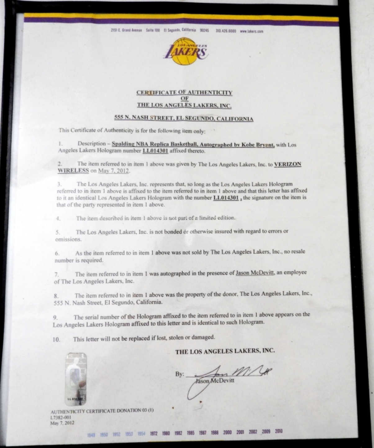 LA LAKERS LETTER of AUTHENTICITY 2012 with HOLOGRAM STICKER on BALL – SPALDING NBA REPLICA BALL AUTOGRAPHED by KOBE BRYANT