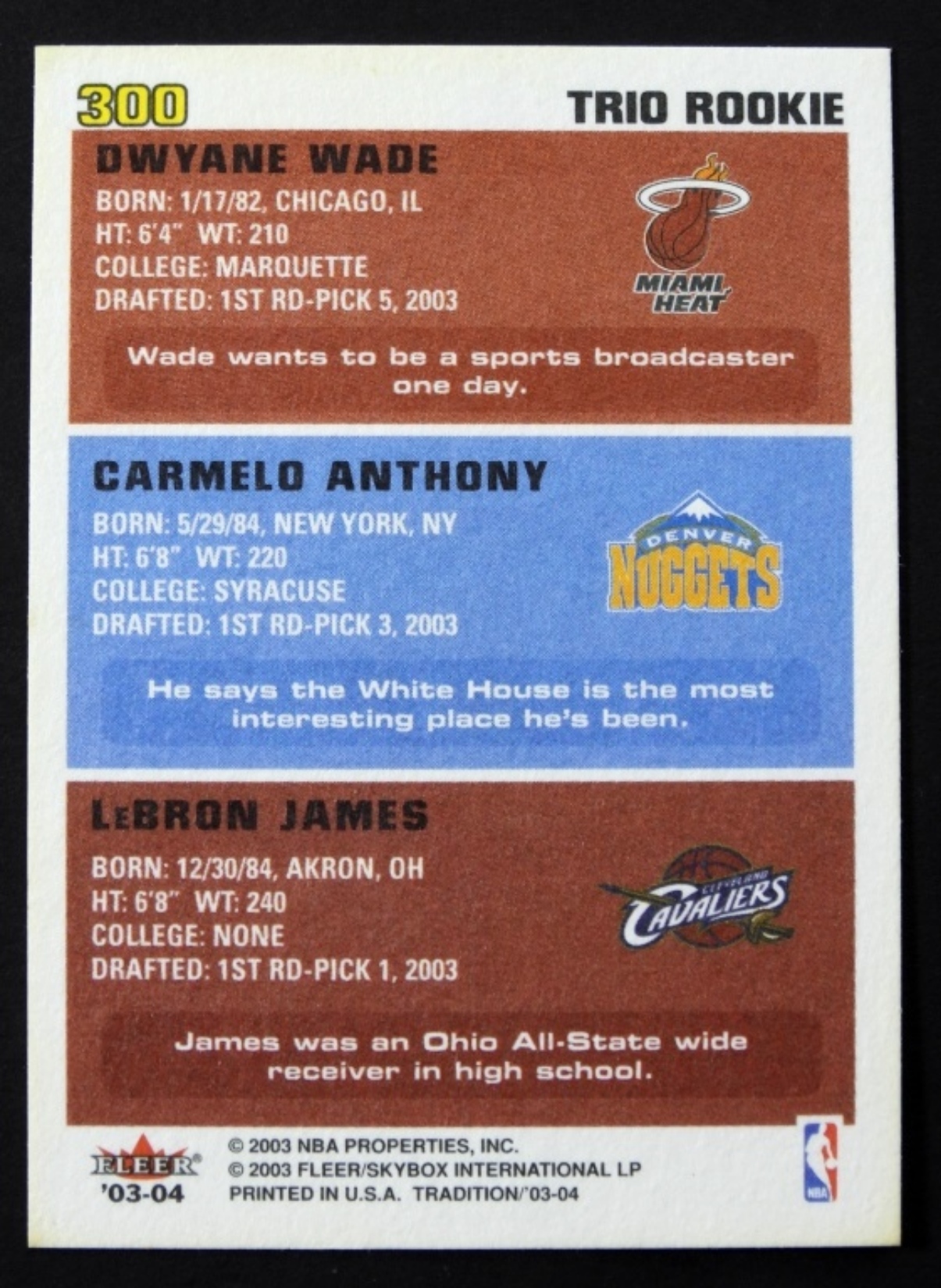 TRIO ROOKIE – LEBRON JAMES / CARMELO ANTHONY / DWAYNE WADE – light stain bottom o/w NM/MT