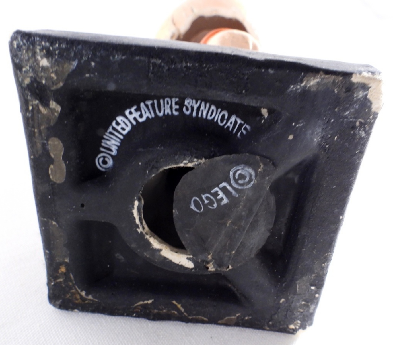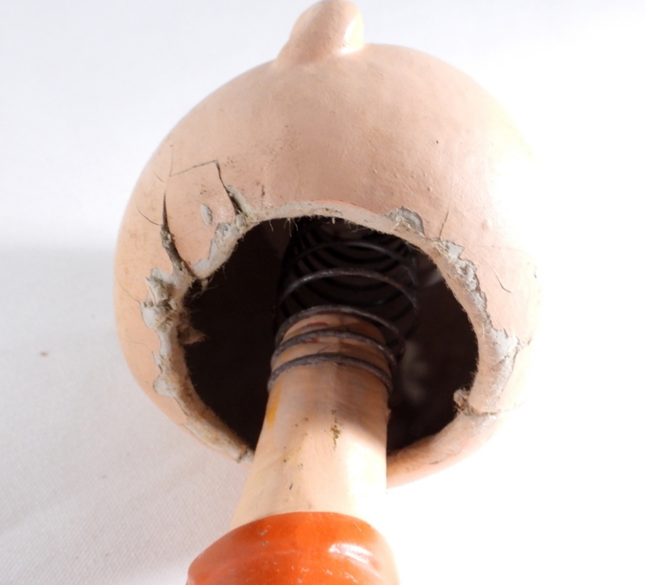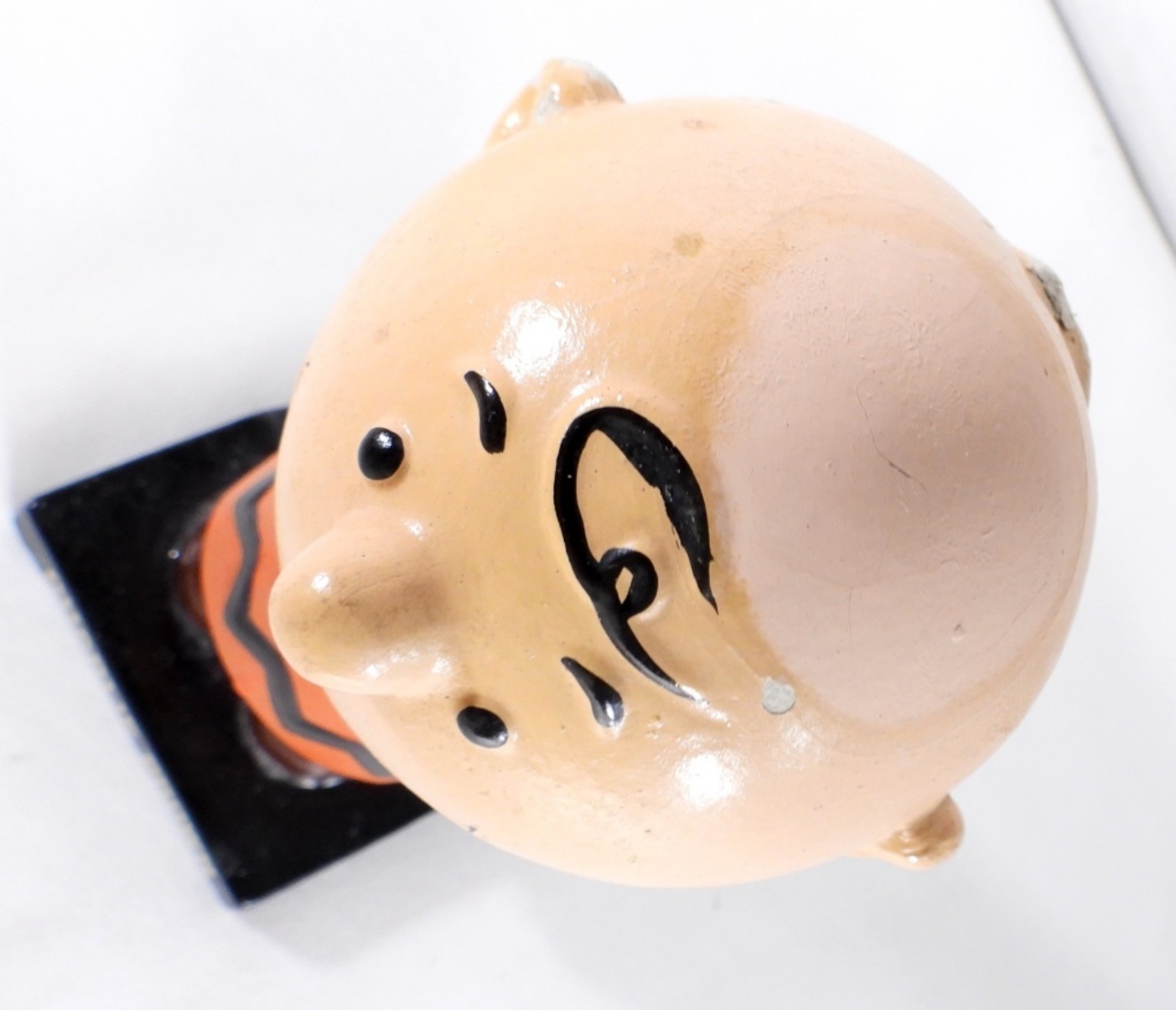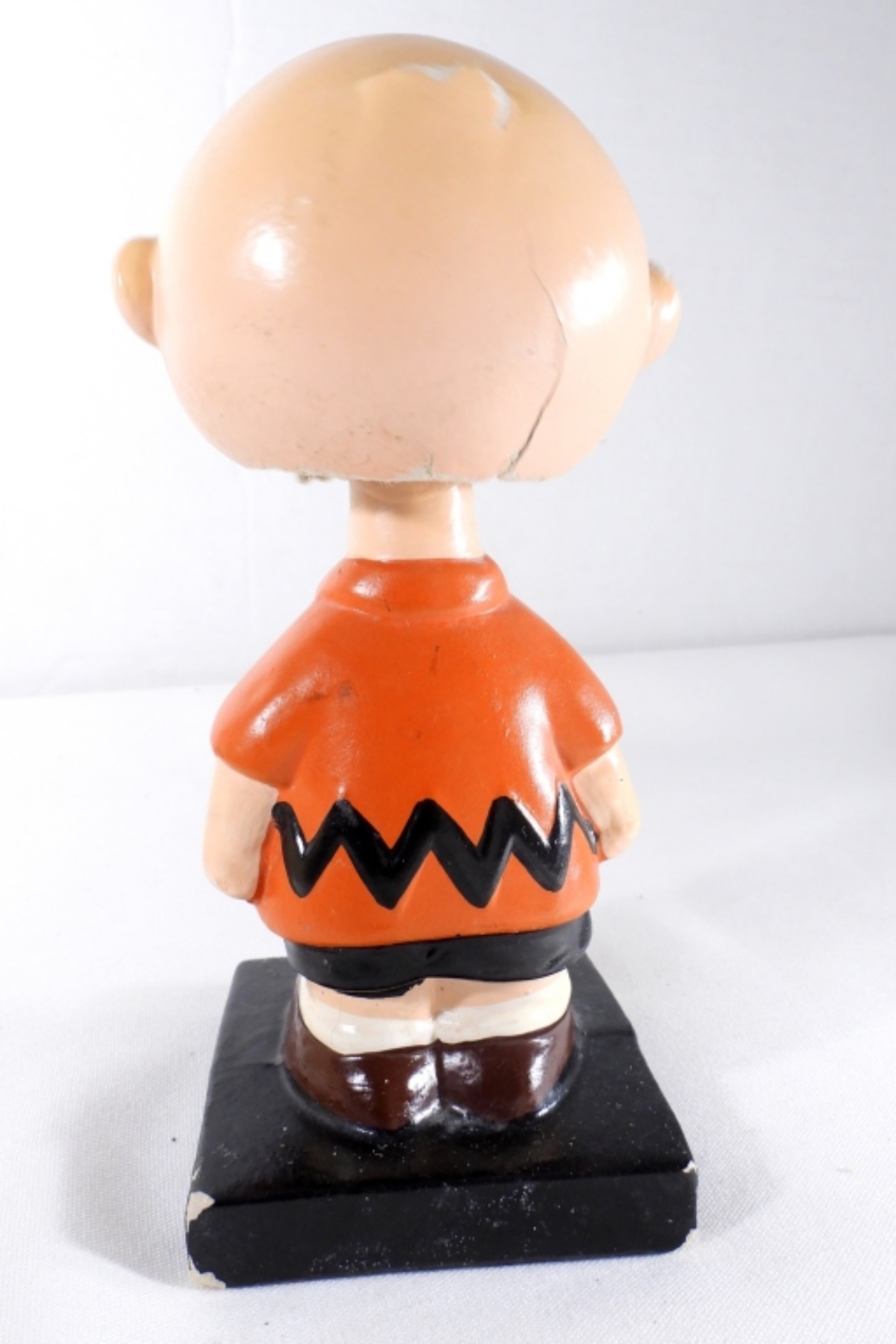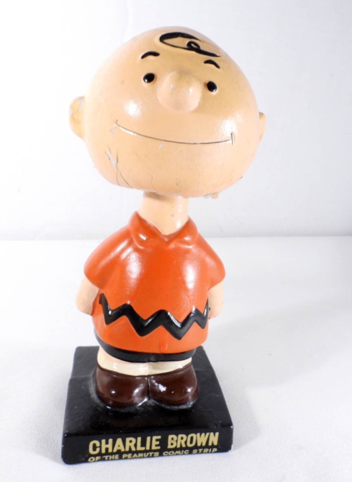 1964 VINTAGE CHARLIE BROWN BOBBLE HEAD, MISSING HIS HAT, WEAR AND CRACKS ON THE BOTTOM OF THE HEAD AND EARS, MARKING ON THE BOTTOM OF BASE