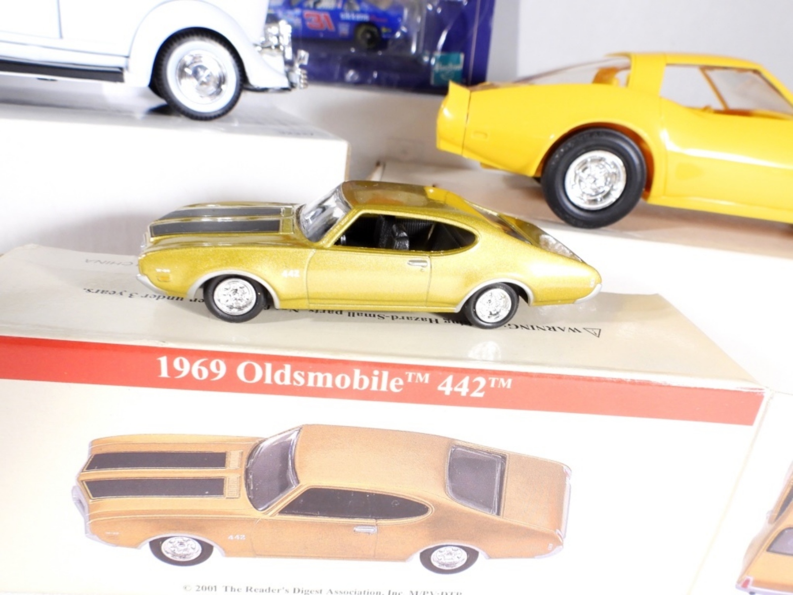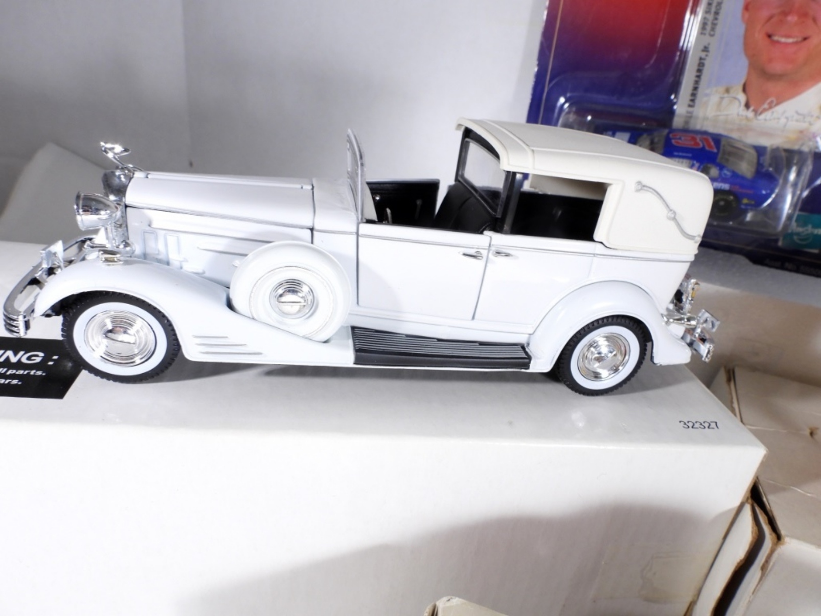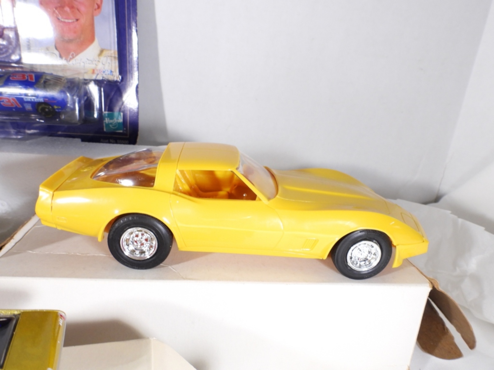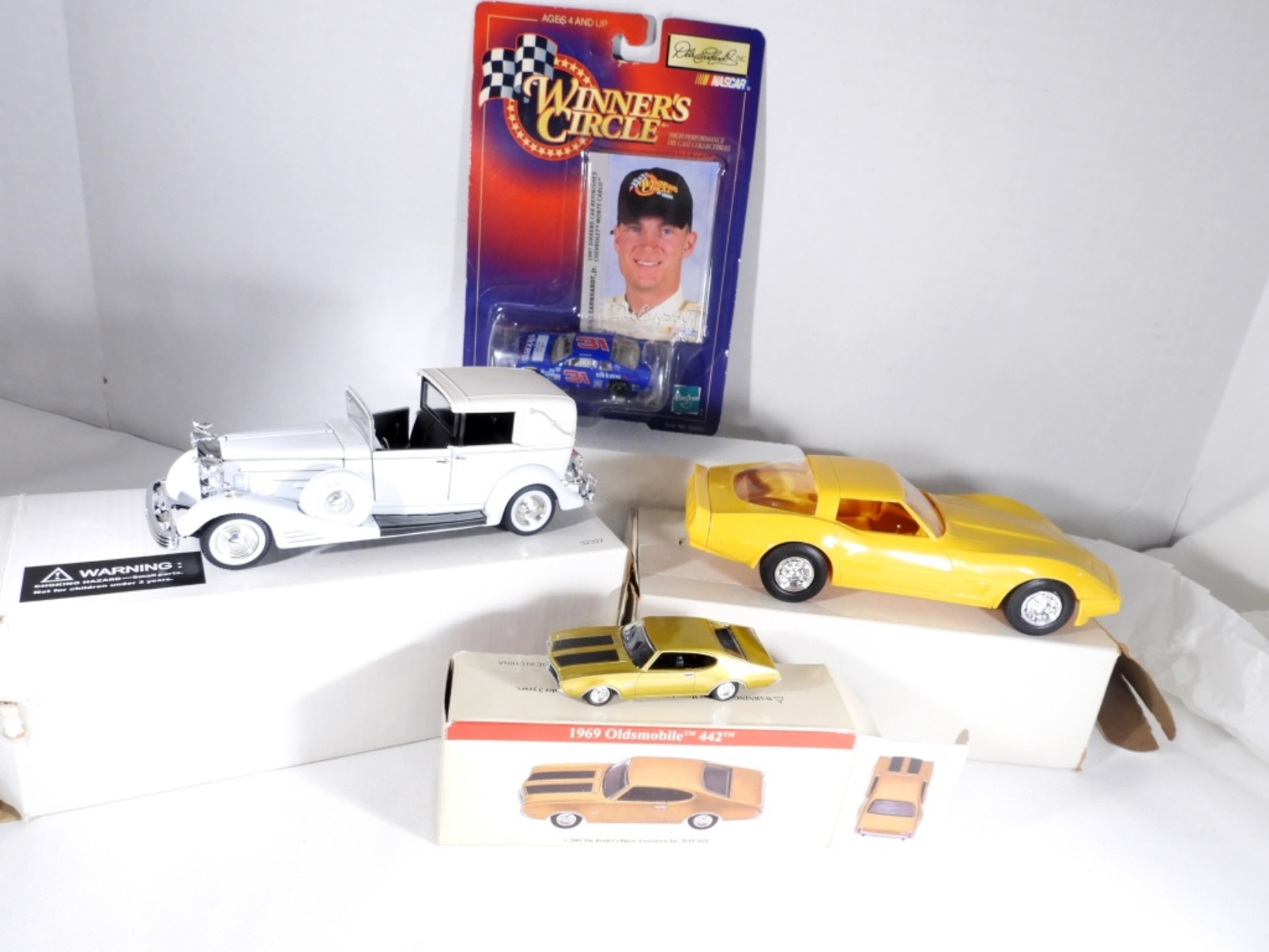 (4) VARIETY TOY CARS, YELLOW 1980 CORVETTE, 1933 CADILLAC TOWN CAR, 1969 OLDS MOBILE, DALE EARNHARDT JR WINNERS CIRCLE RACE CAR