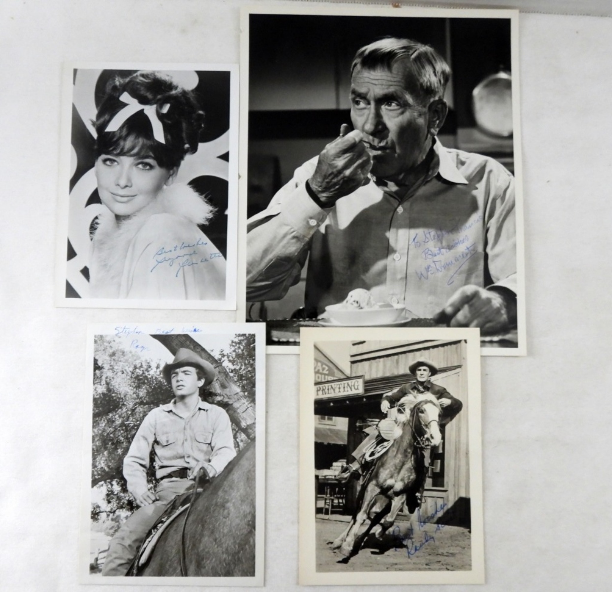 AUTOGRAPHED / PERSONALIZED PHOTOS OF RANDOLPH SCOTT, SUZANNE PLESHETTE, ROGER MOBLEY & WILLIAM DEMAREST. BACK OF DEMAREST’S PHOTO IS INSCRIBED WITH “Starting JAN 6TH /65 Will be in My Three Sons as Uncle Charlie”. NO COA’s