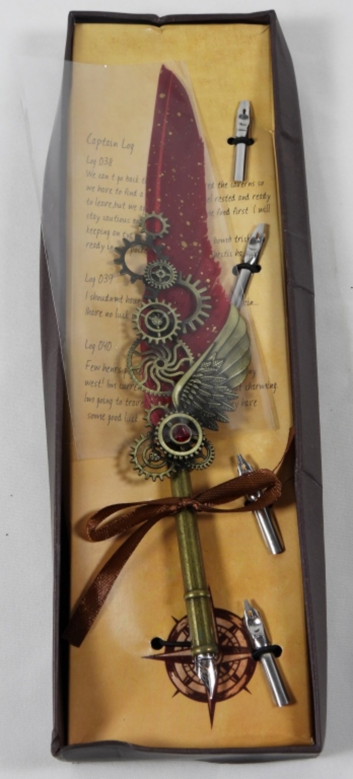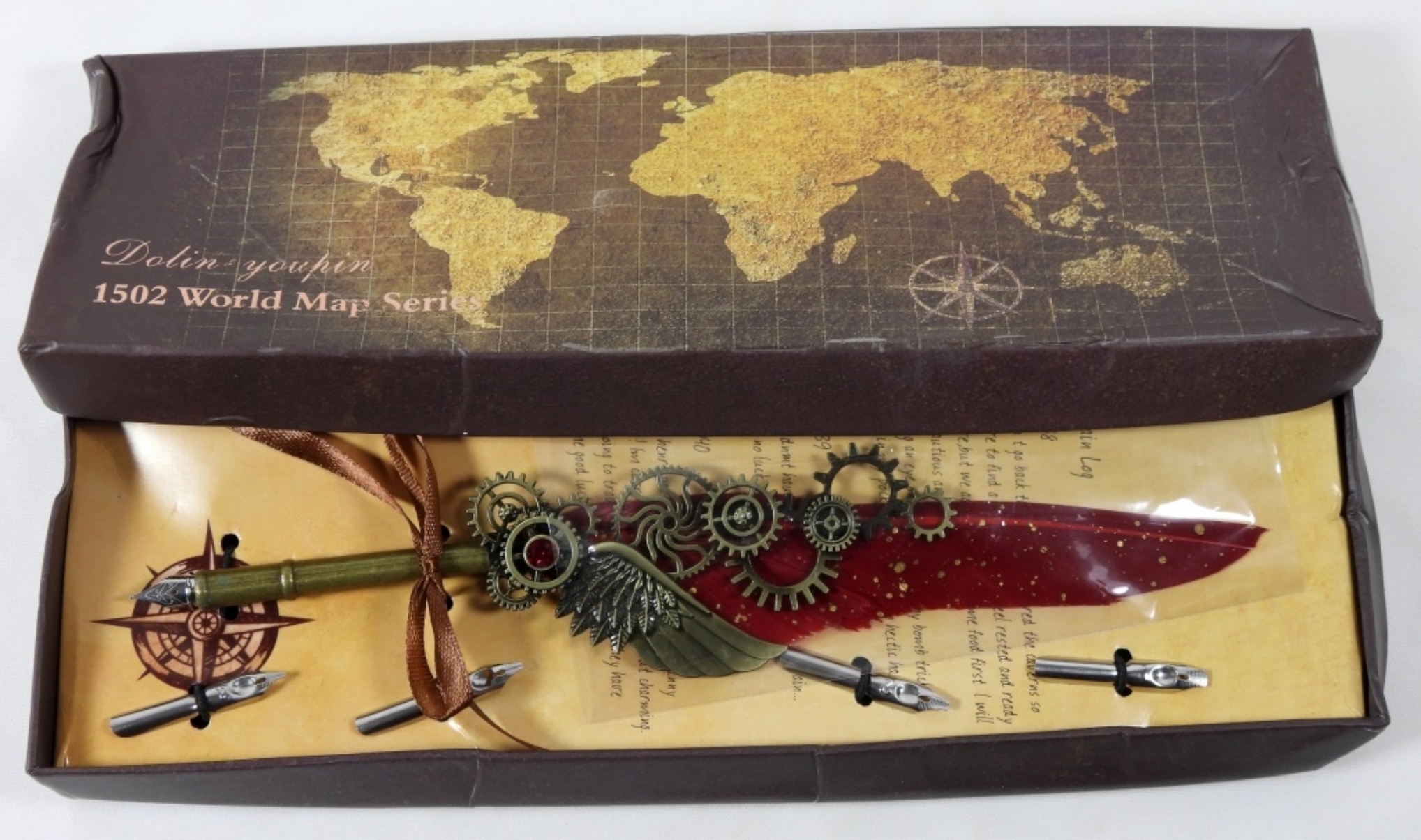 FROM THE 1502 WORLD MAP SERIES STEAMPUNK RED FEATHER CALLIGRAPHY PEN. COMPLETE SET, STILL IN THE BOX (BOX IS SMOOSHED)