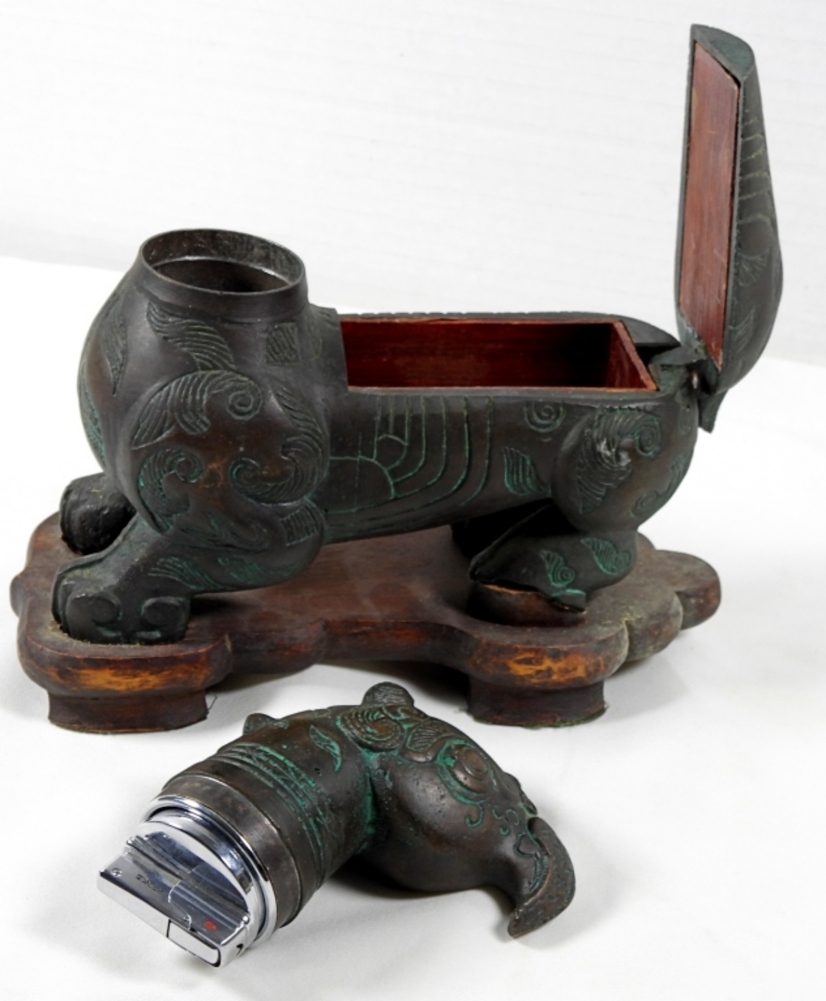 MADE BY JAMES MONT, SOME WEAR ON THE BACK AND SIDE, BACK OPENS UP AND HEAD POPS OFF TO GET TO YOUR PRINCE LIGHTER