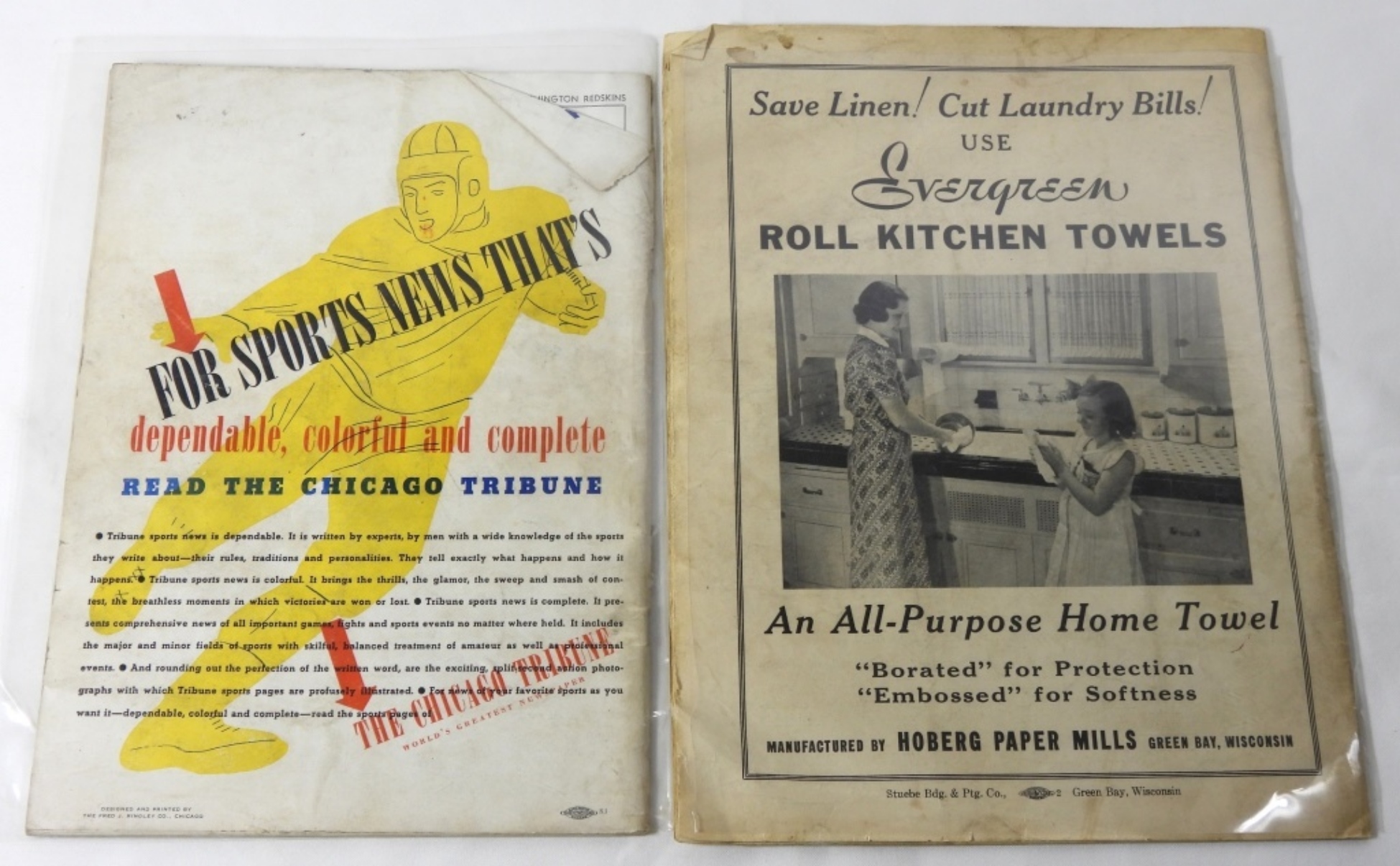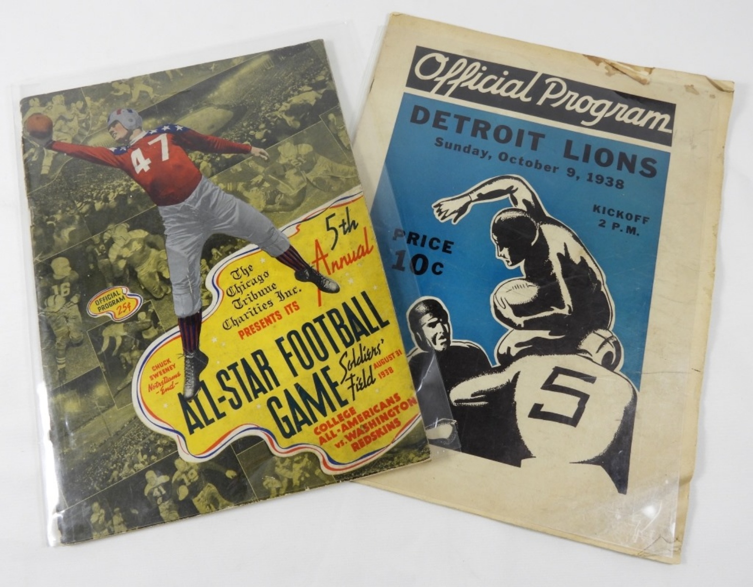1- OCT 9 1938 DETROIT LIONS, 1- THE CHICAGO TRIBUNE CHARITIES INC PRESENTS IT ALL-STAR FOOTBALL GAME SOLDIERS FIELD AUGUST 31 1938 COLLEGE ALL AMERICANS VS WASHINGTON REDSKINS, HAS NORMAL WEAR FROM THE YEARS
