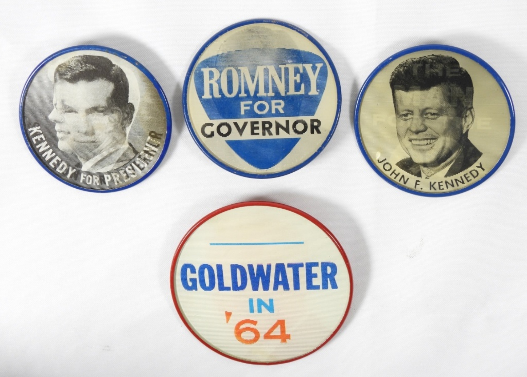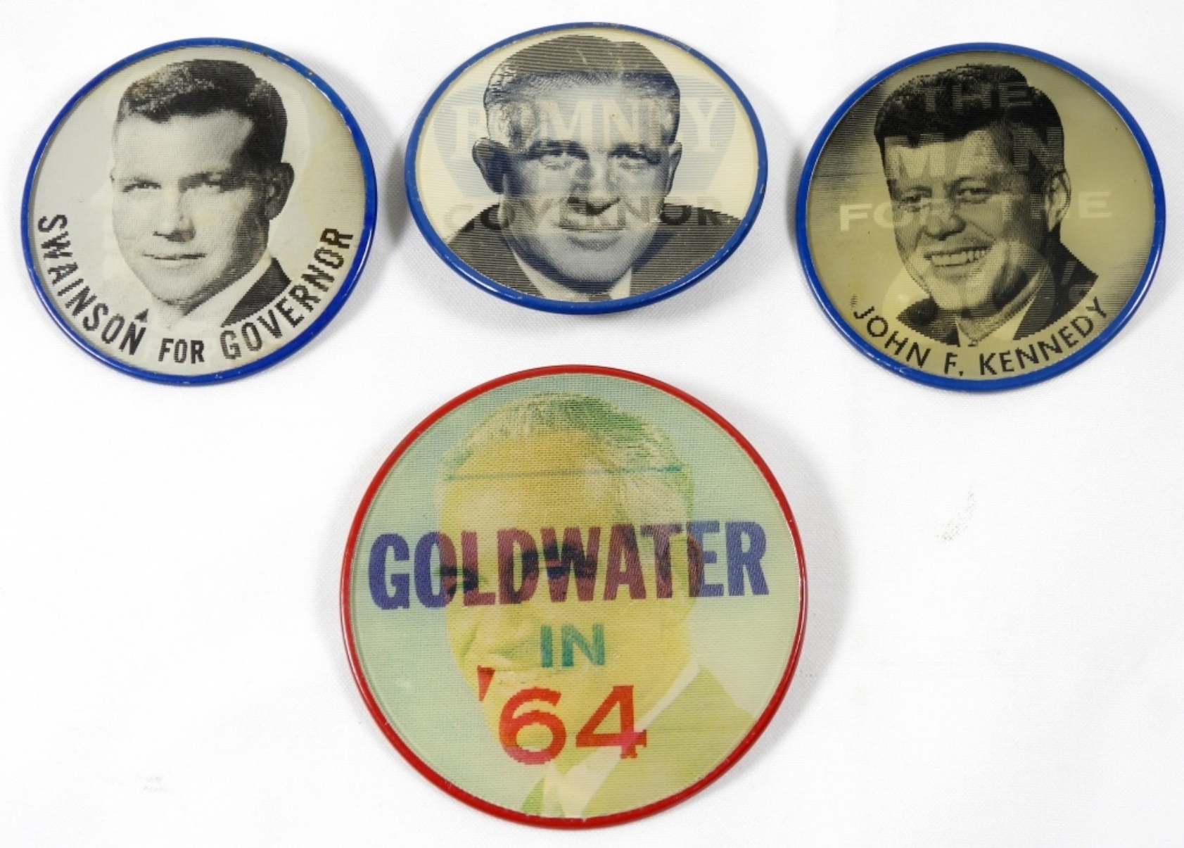 1- ” THE MAN FOR THE 60S JOHN F KENNEDY”, 1- KENNEDY AND SWAINSON PIN, 1- GOLDWATER IN ’64 AND 1- ROMNEY FOR GOVERNOR