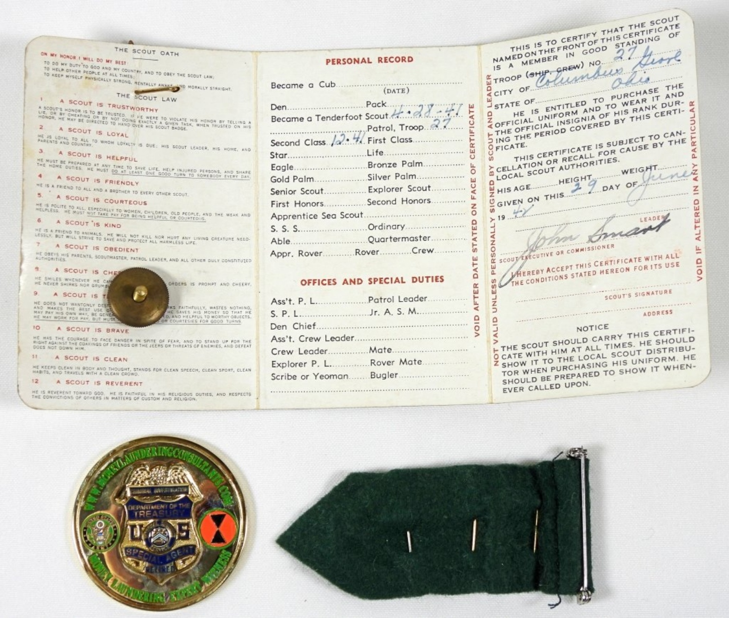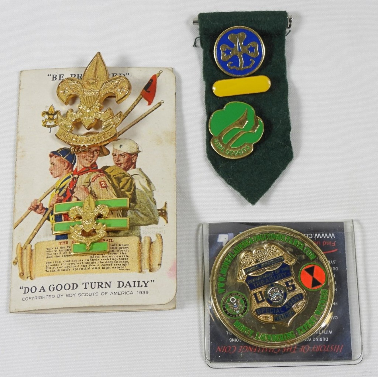 GIRL SCOUT PIN/RIBBON & CHALLENGE COIN DEPT of the TREASURY SPECIAL AGENT RETIRED!