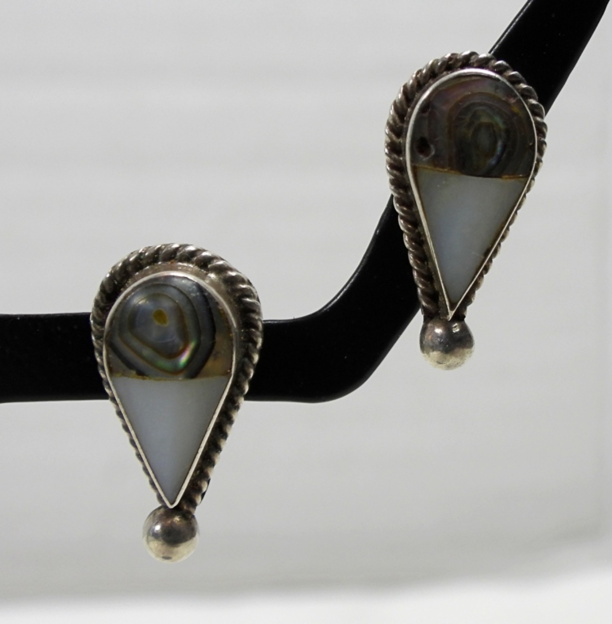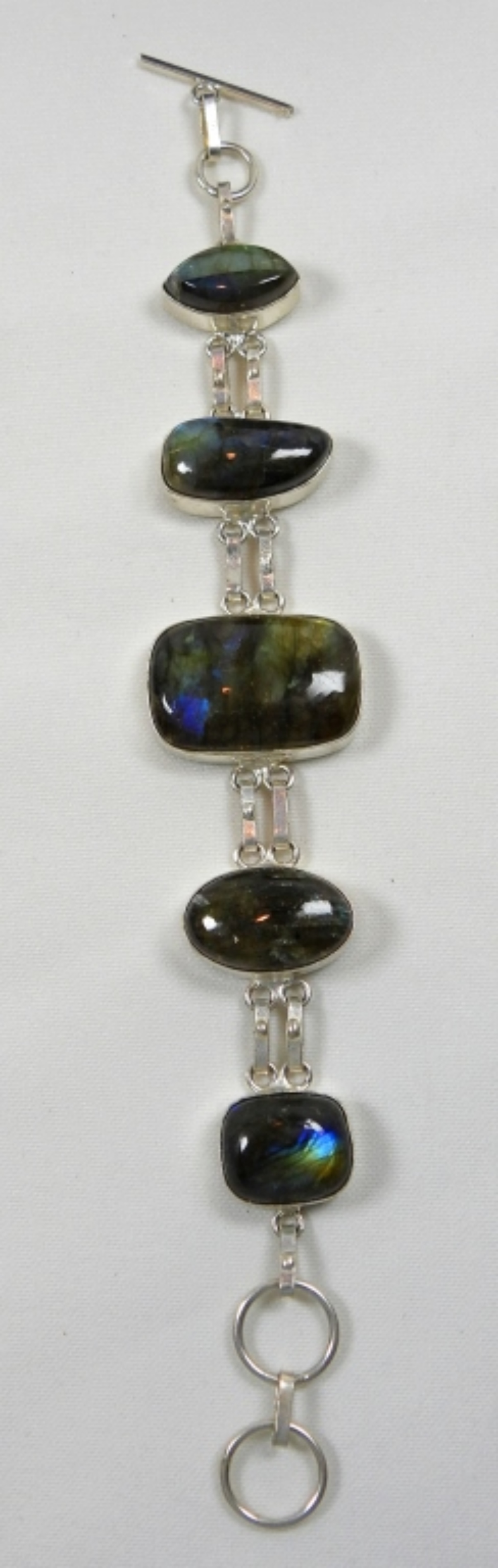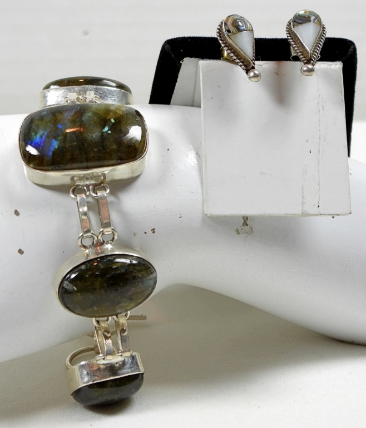 8″ LABRADORITE GEMSTONE BRACELET. MOTHER OF PEARL & ABALONE PIERCED EARRINGS DWT (19.2)
