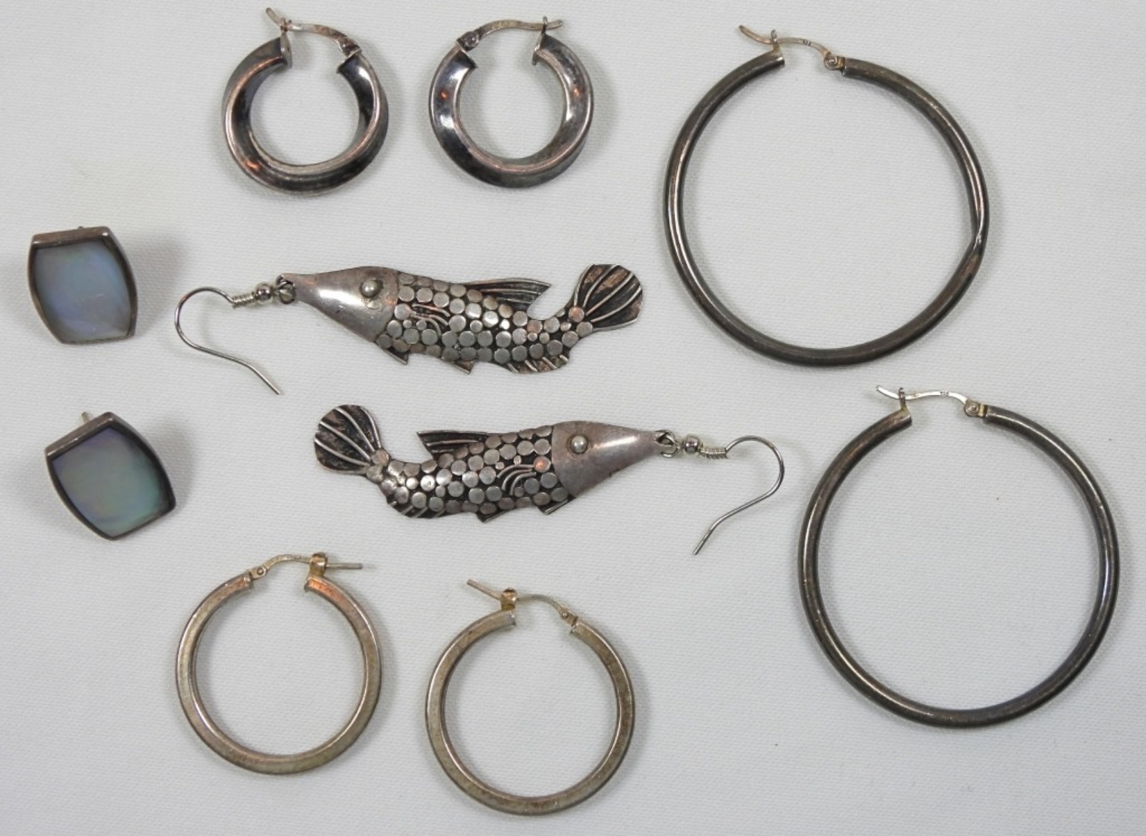 (5) VARIETY EASRING SETS, 3 HOOPS SETS, 1 FISH SET, 1 PEARL GEM STONE SET DWT (18.5)
