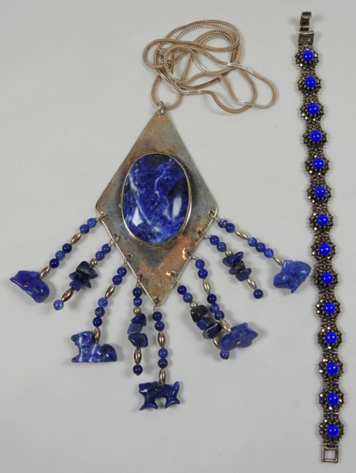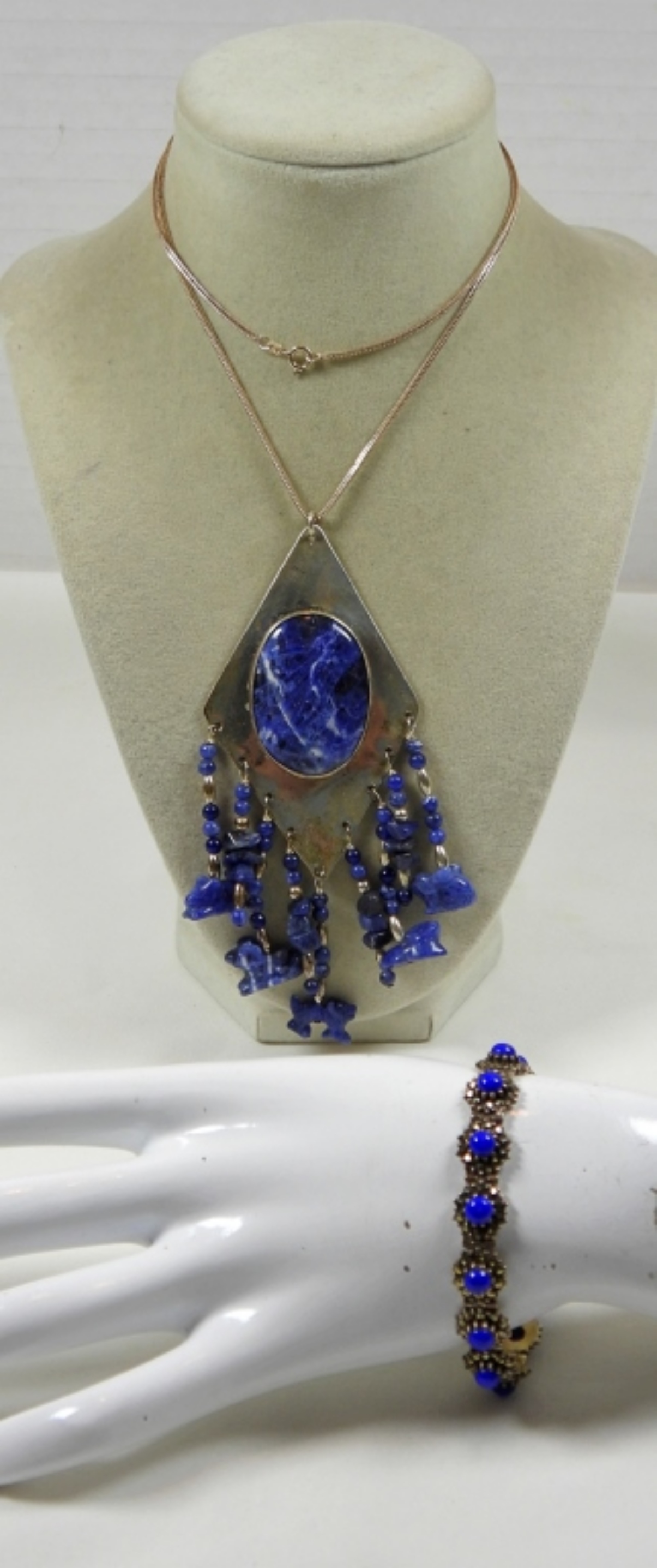 CARVED NATURAL BLUE STONE PENDANT on 24″ CHAIN with 7″ BRACELET (50 DWT)