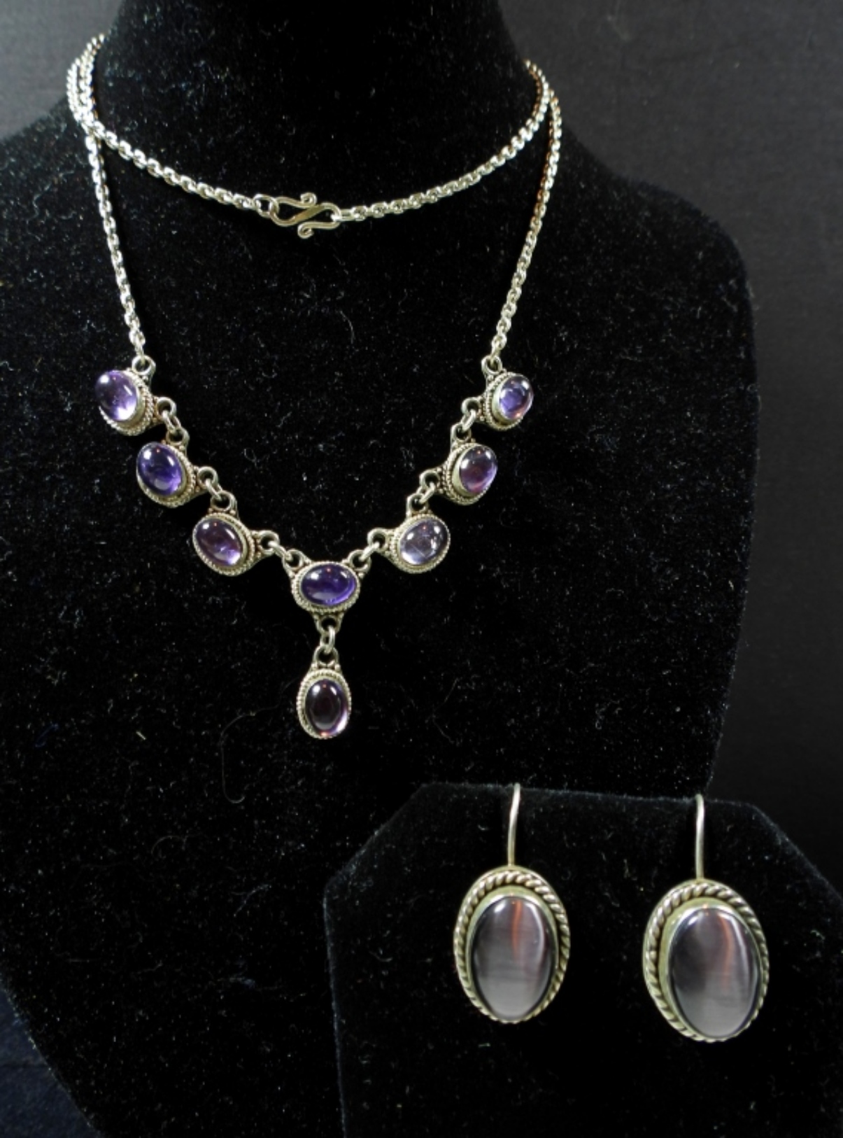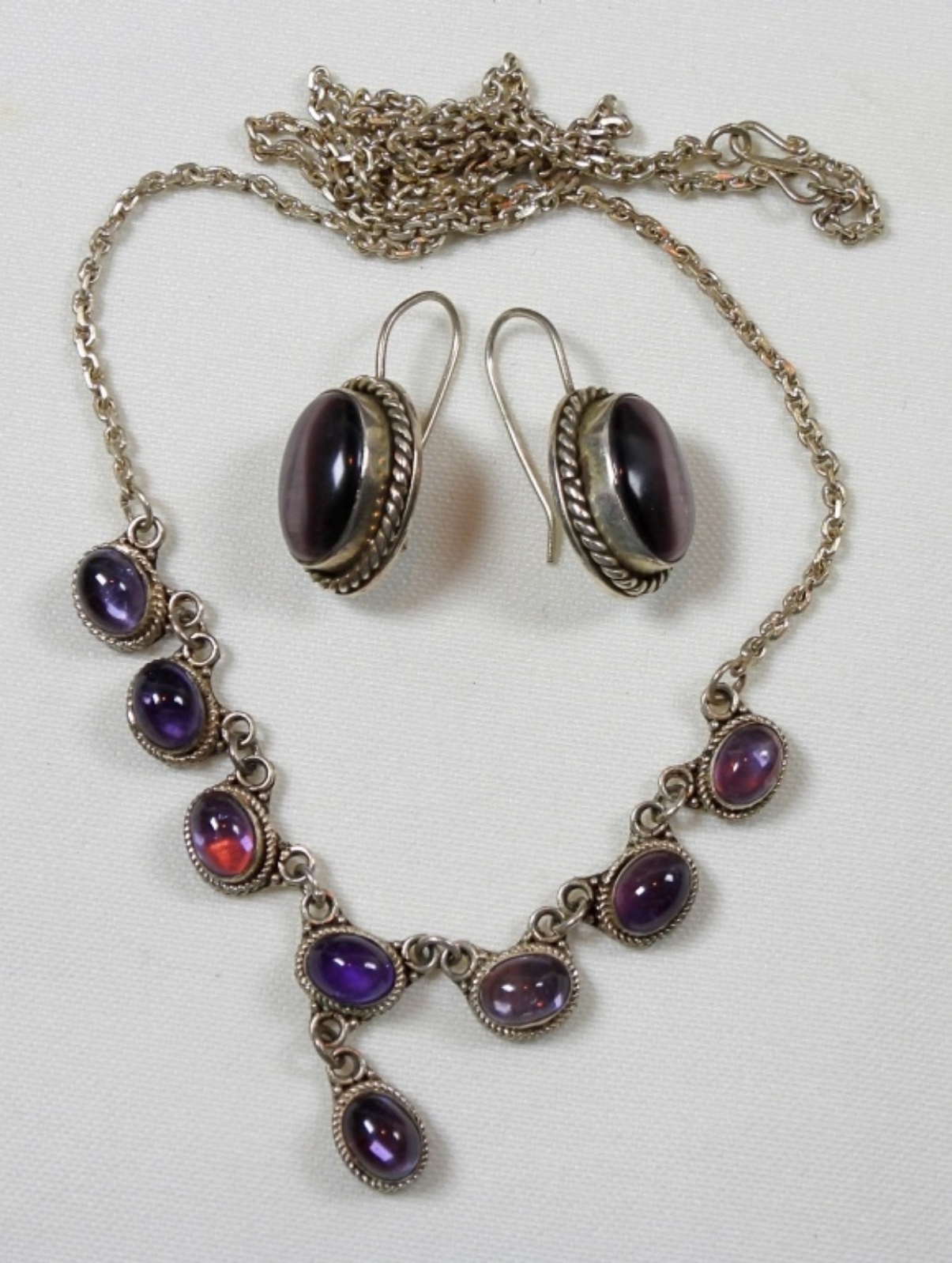 AMETHYST NECKLACE 21″, CATS EYE PIERCED EARRINGS (15 DWT)