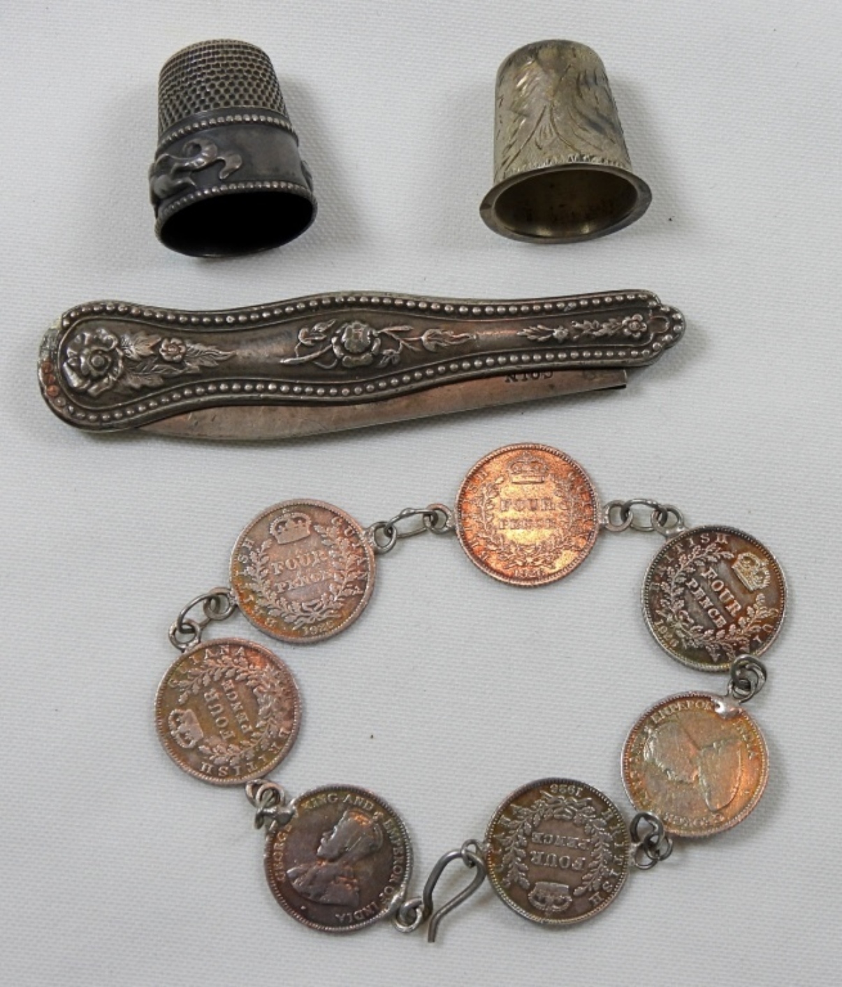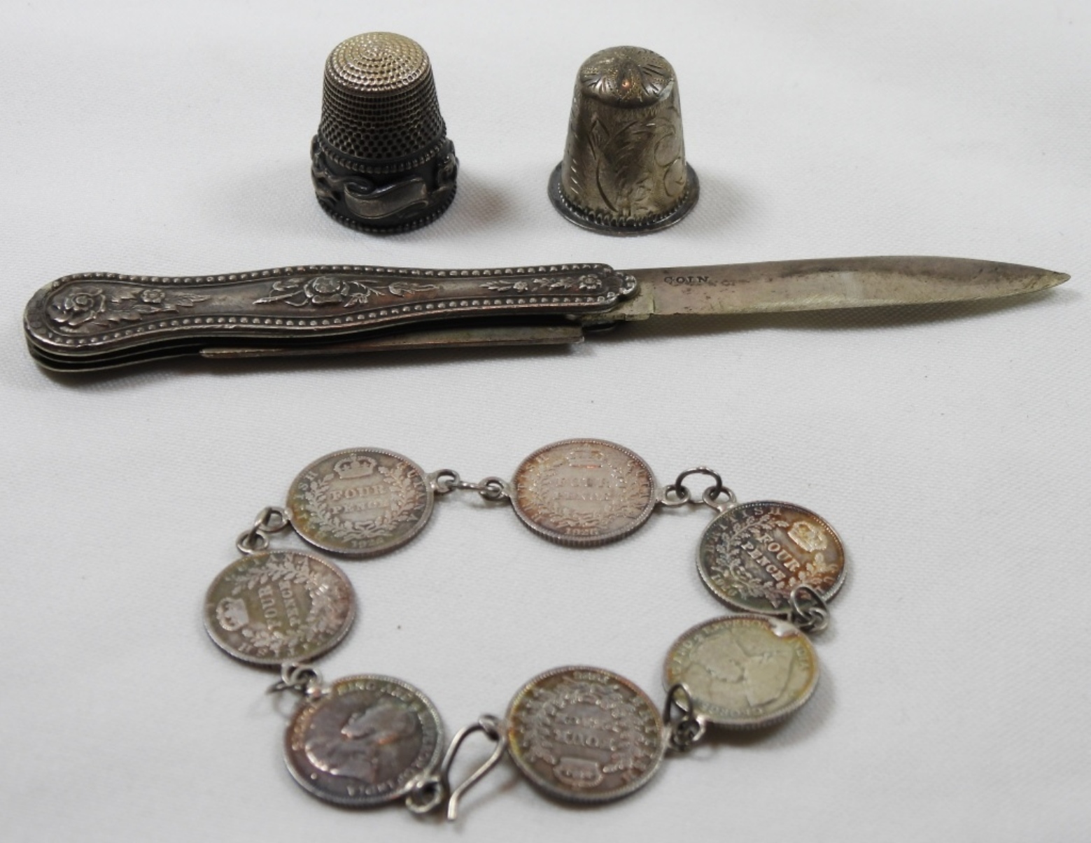 (2) STERLING THIMBLES & SILVER FOREIGN COIN BRACELET – KNIFE is ENGRAVED “BACHELORS TO ADDIE” (30 DWT)