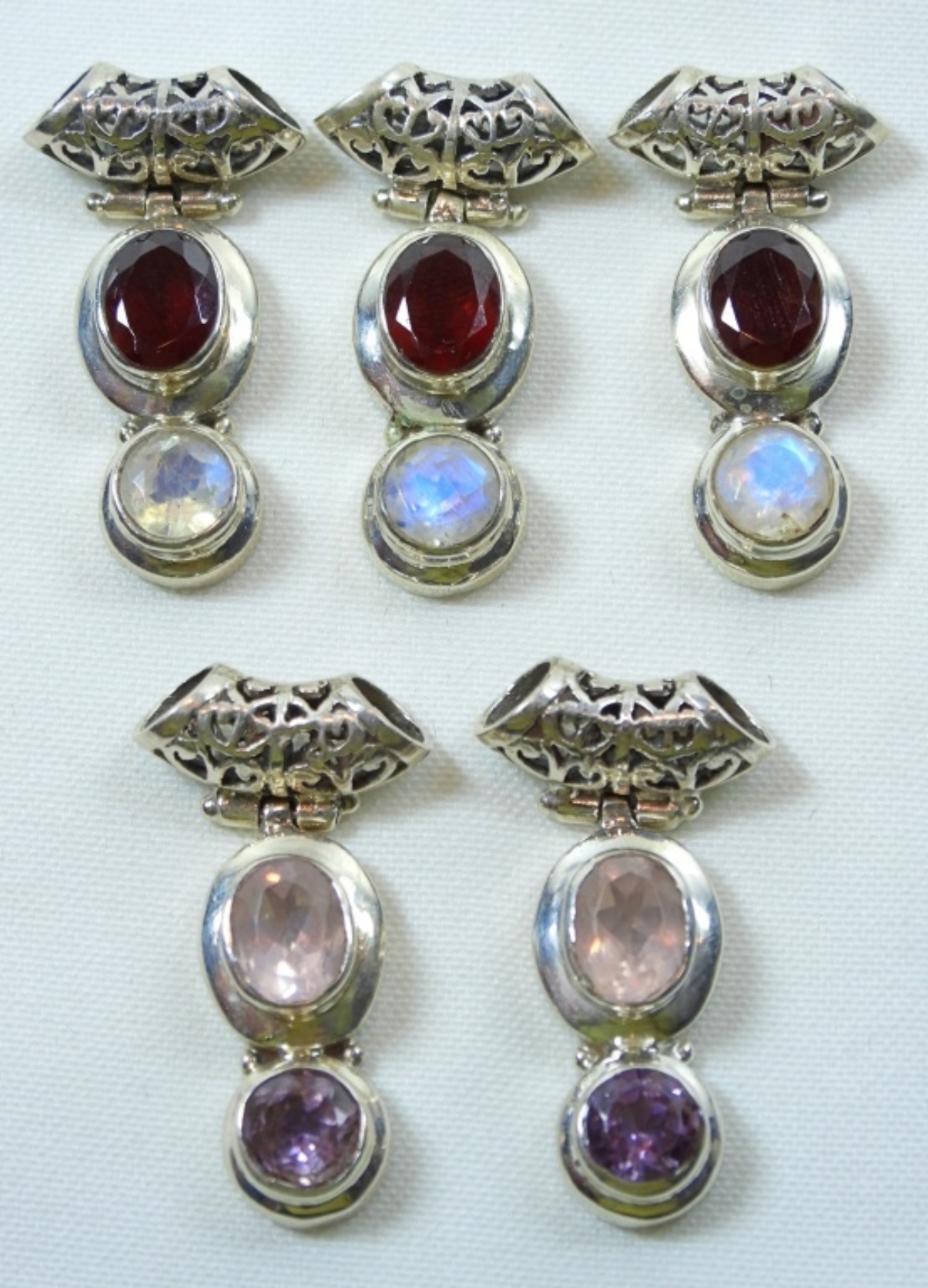 MOONSTONE, GARNET, ROSE QUARTZ & AMETHYST GEMSTONES IN 5 STERLING PENDANTS. (21 DWT)