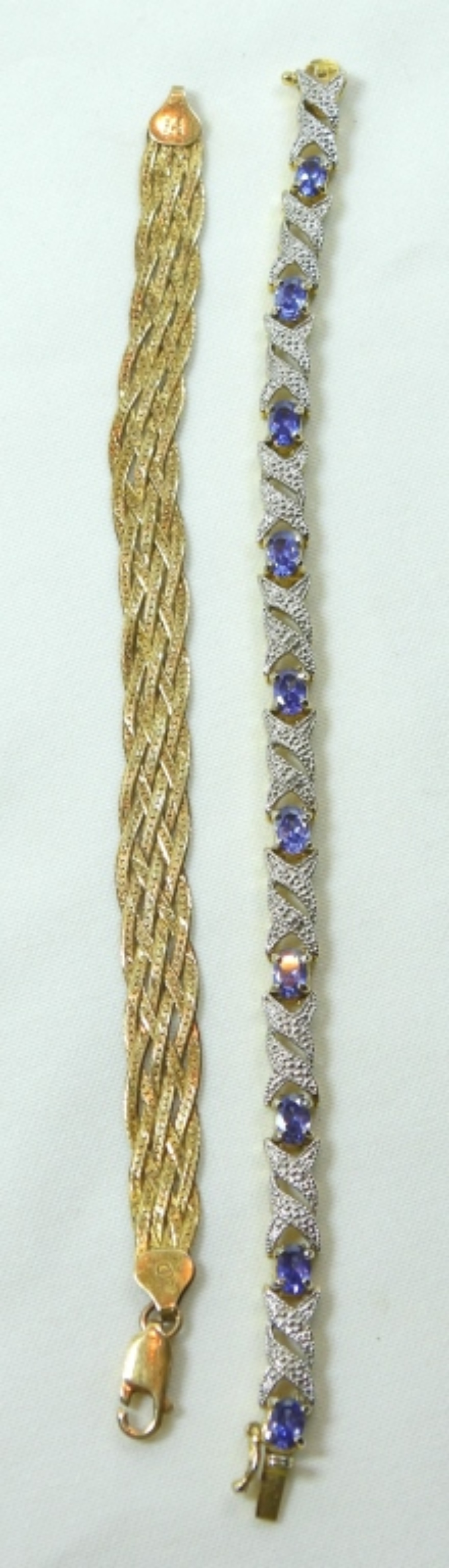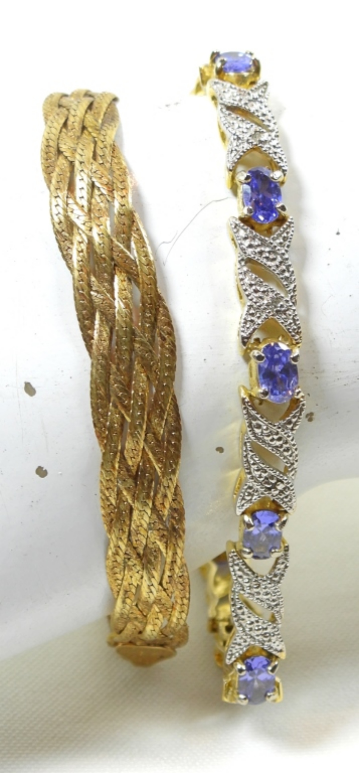 1 7” PLAIN GOLD COLORED STERLING BRACELET, 1 7.5” CLEAR AND PURPLE GEM STONE BRACELET DWT (13.4)