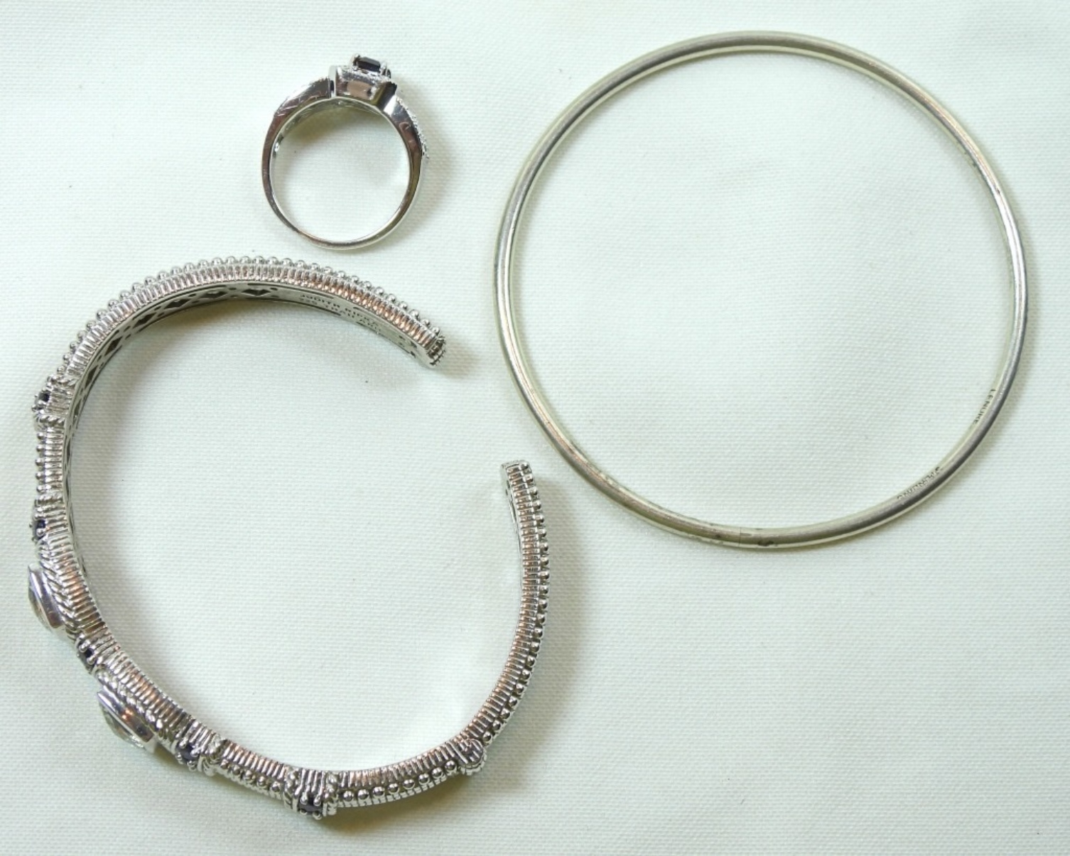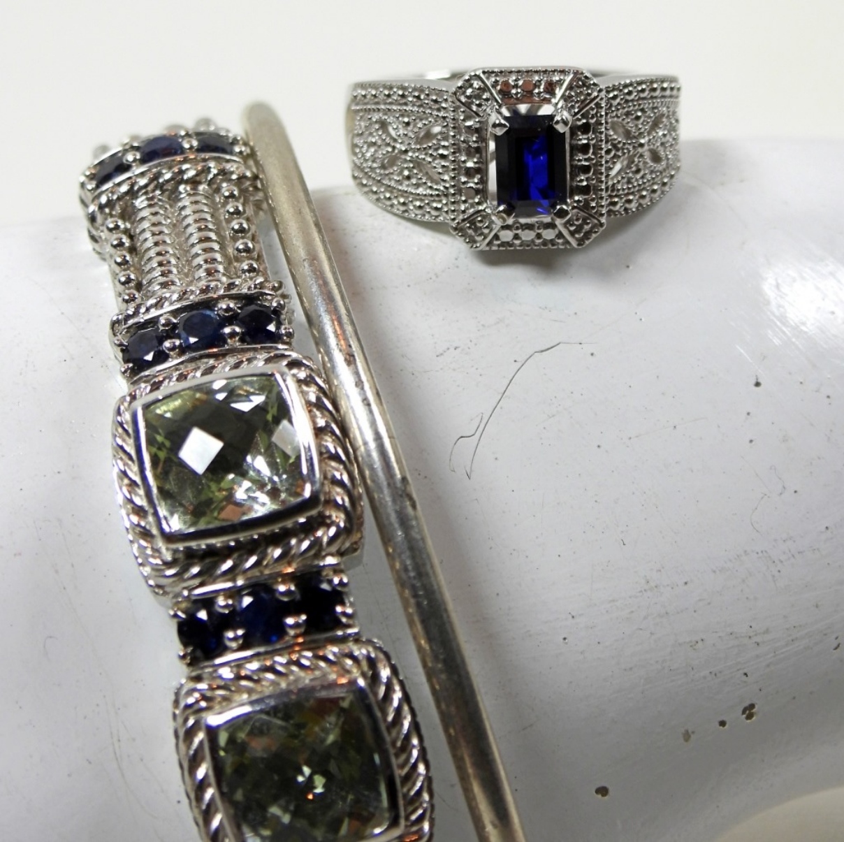 2 STERLING SLIDE ON BRACELETS ONE WITH DECORATIVE GEMS AND 1 STERLING SIZE 7 RING WITH DECORATIVE GEMS DWT (35.5)