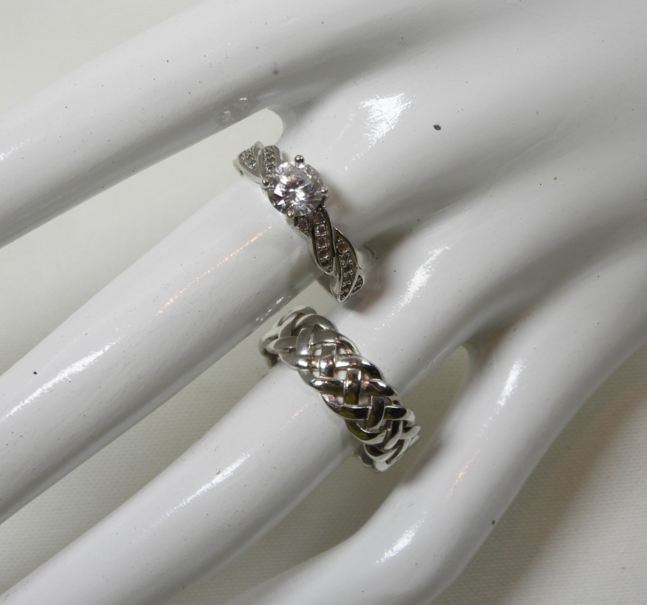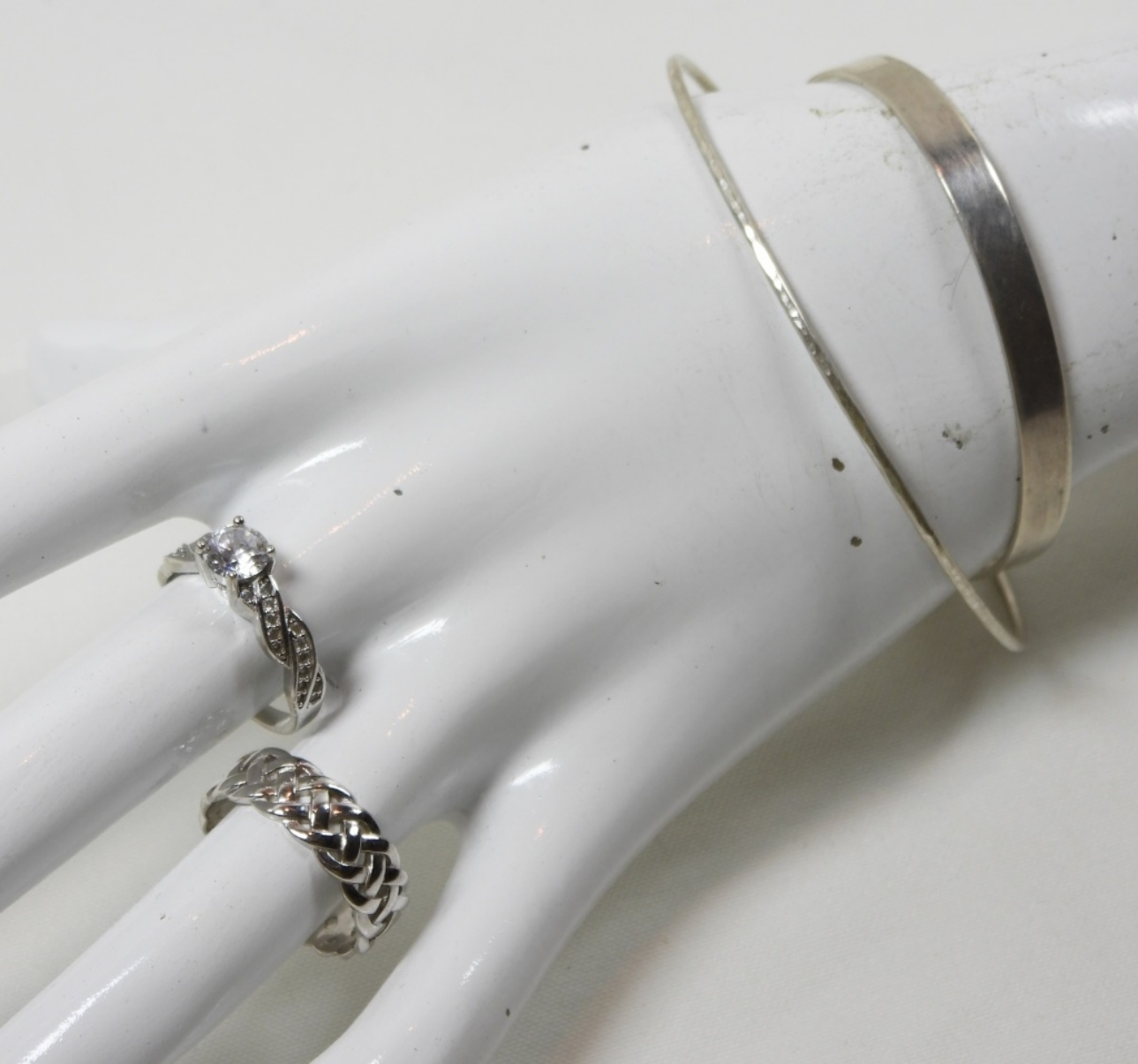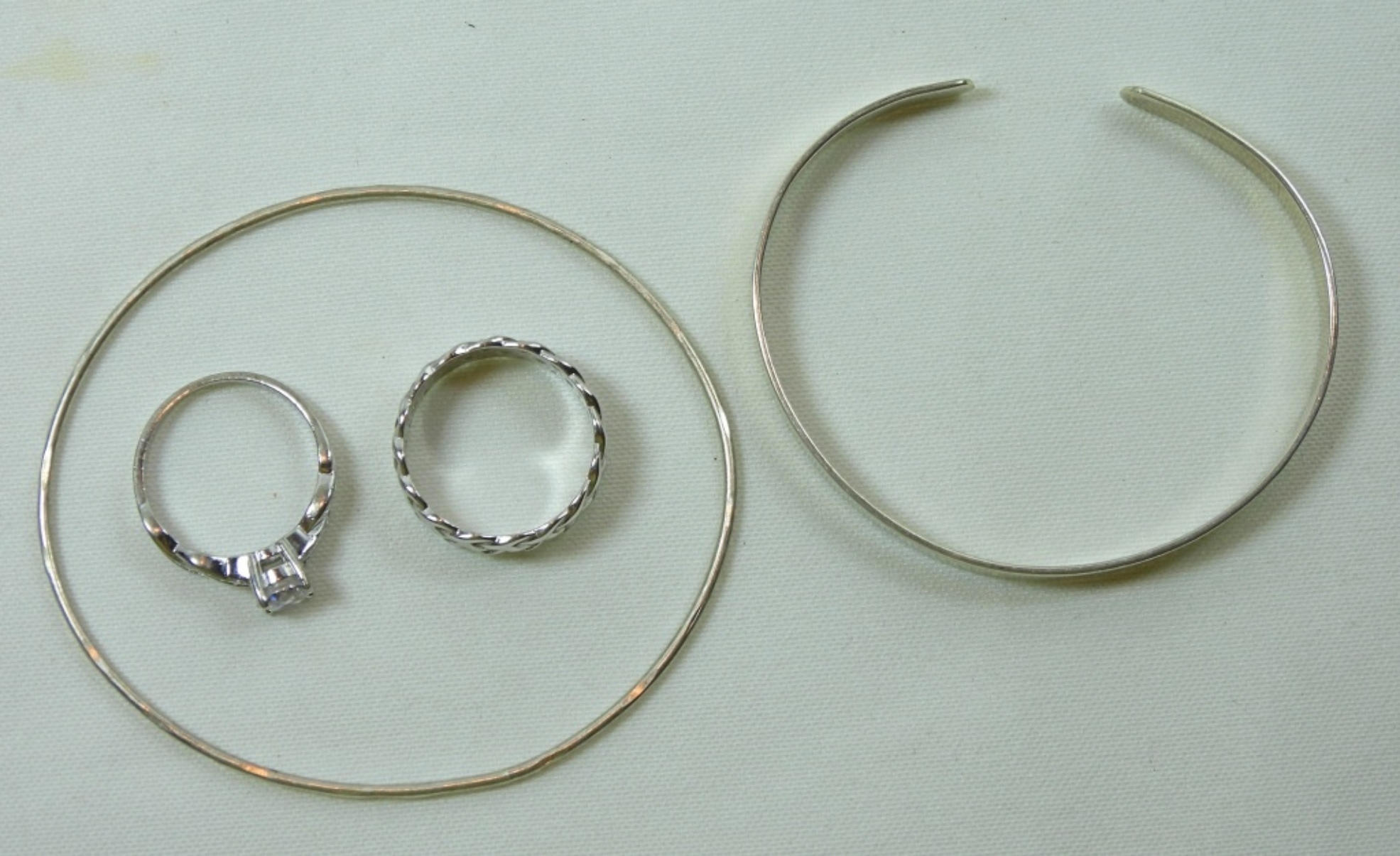 2 SLIDE ON STERLING BRACELETS AND 2 RINGS ONE WITH CLEAR GEM STONE SIZES 8-9 DWT (12.7)