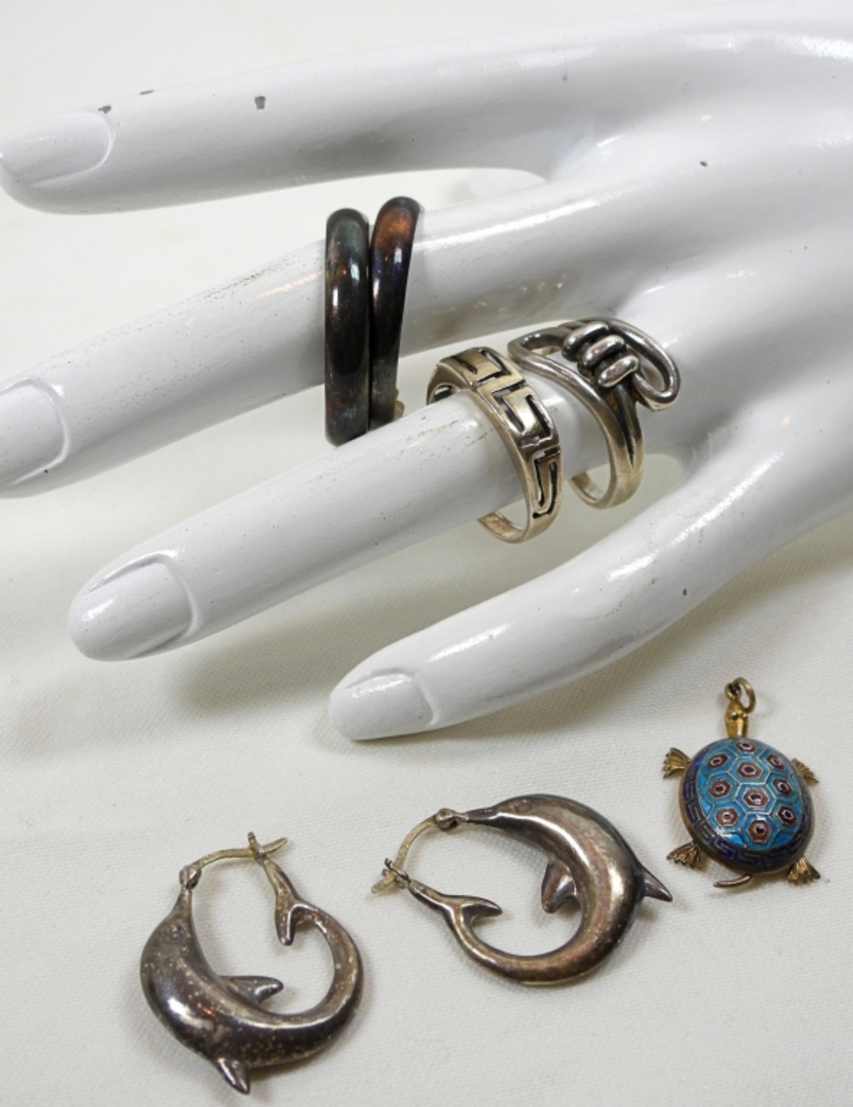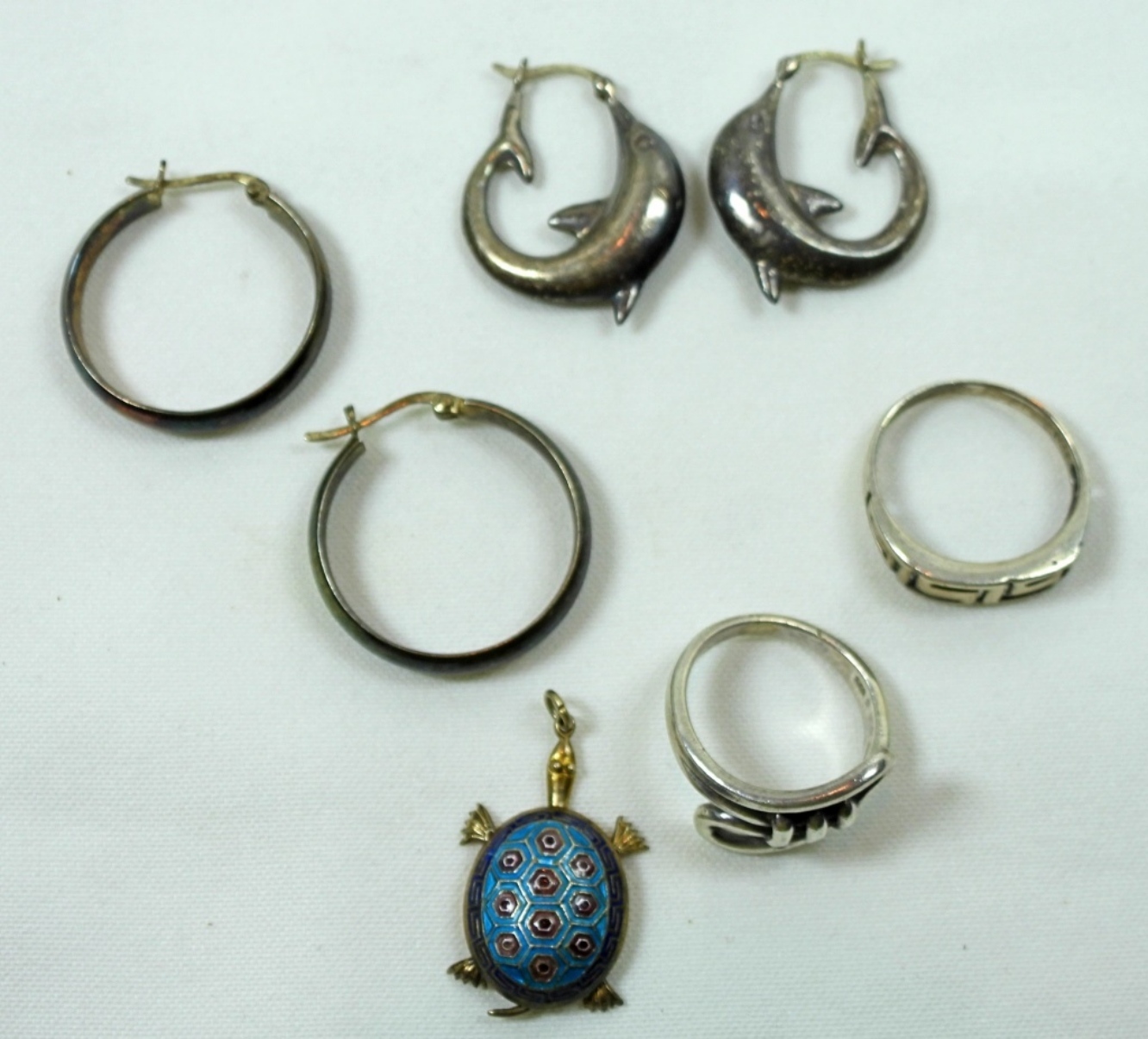 (2) PAIR PIERCED EARRINGS, (2) RINGS SIZE 8.5 & 9.5, ENAMEL TURTLE PENDANT moving parts (13 DWT)