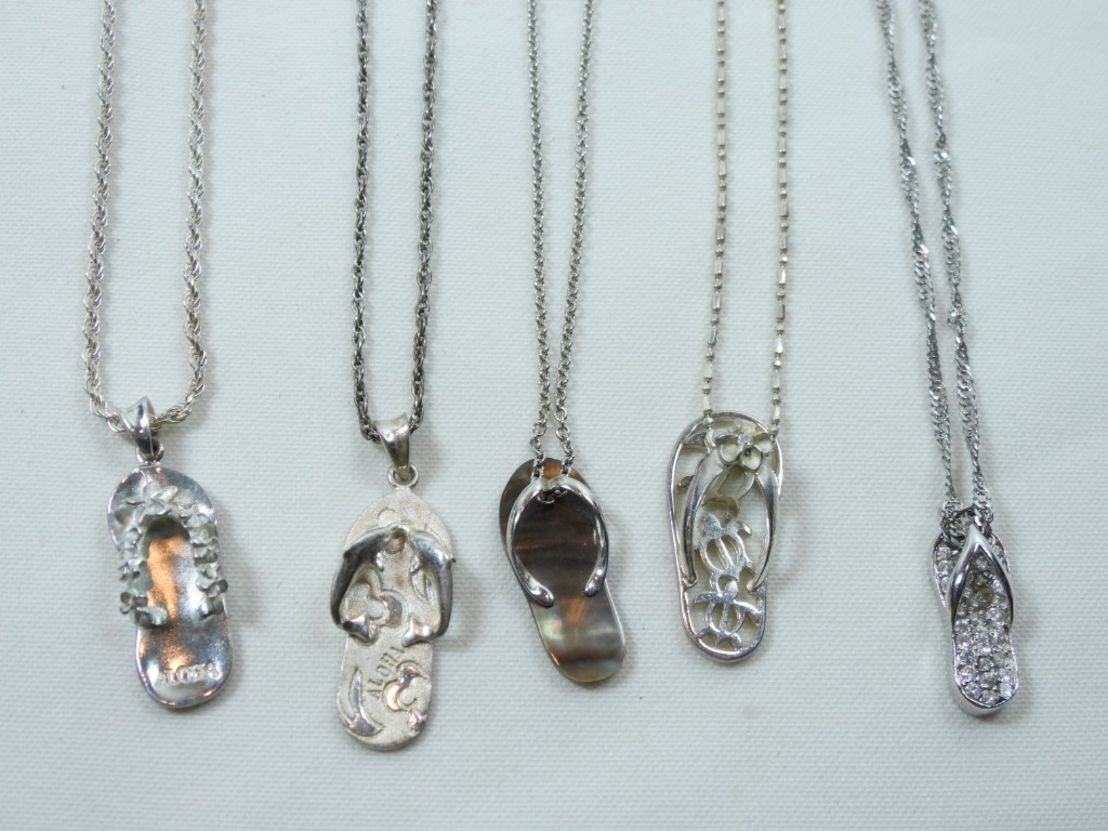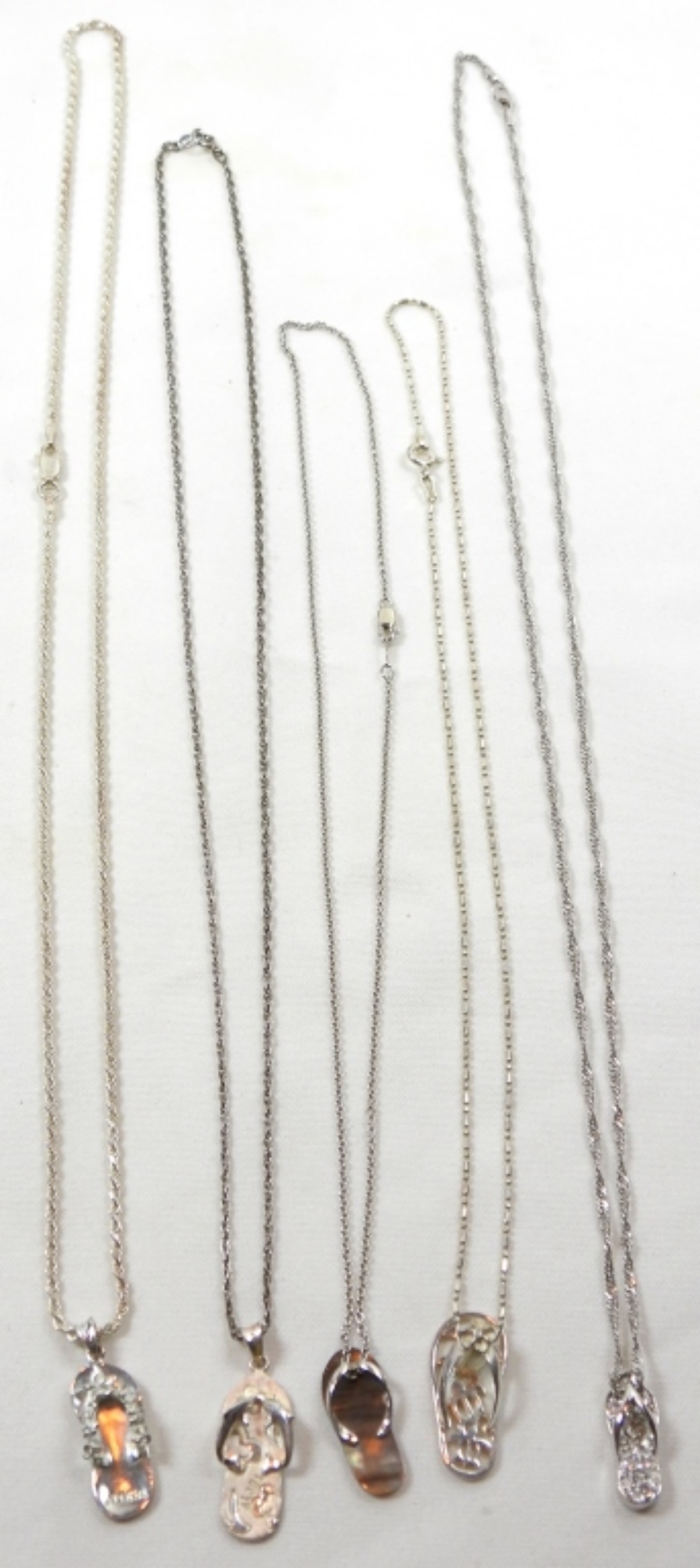 (5) DIFFERENT FLIP-FLOP’s on VARIOUS LENGTH 925 NECKLACES 16″ to 24″ (18 DWT)