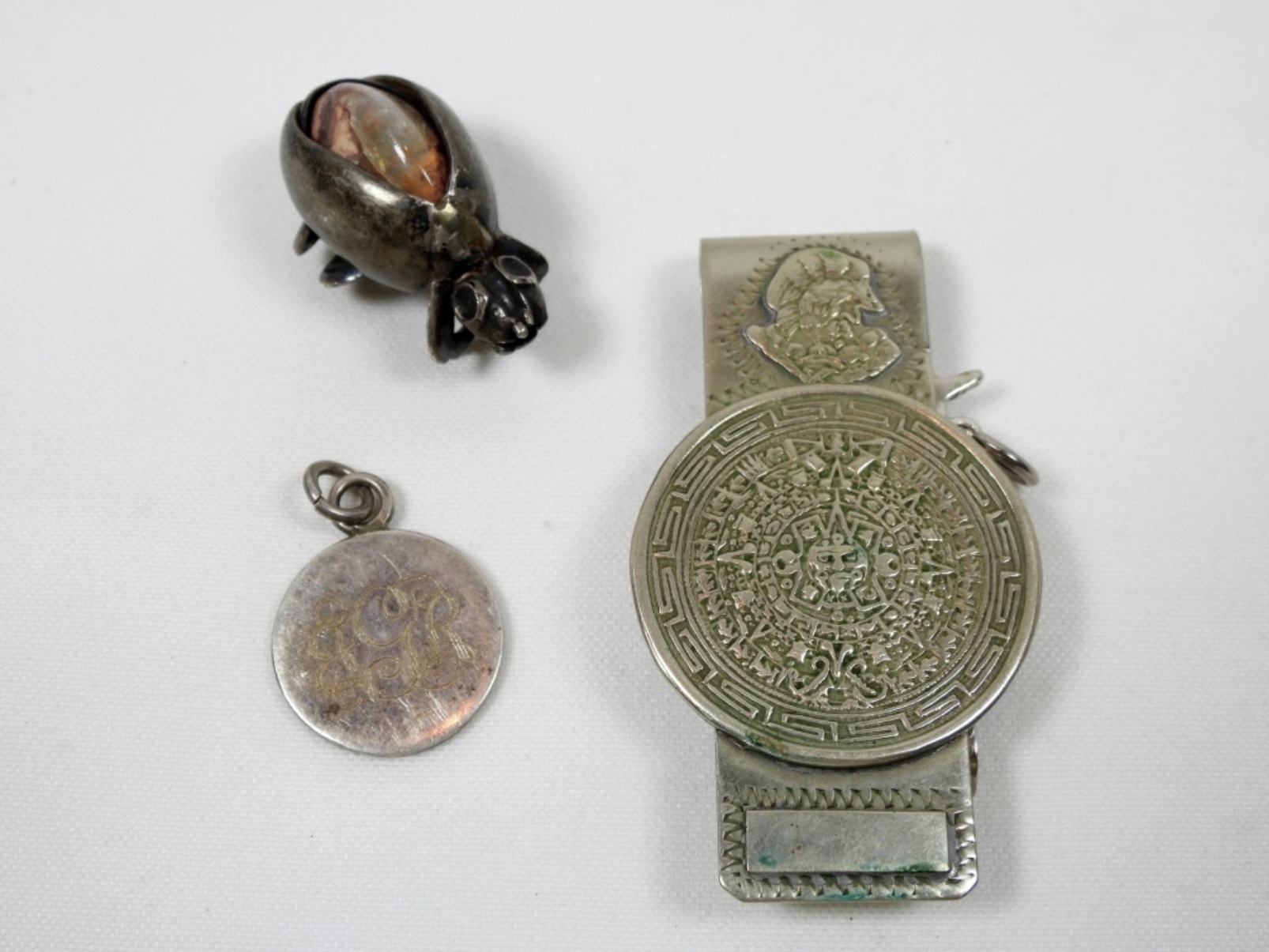 3 STERLING MEXICO STAMPED PENDANTS BUG, HORSE, LETTERS, 1 MEXICO STAMPED MONEY CLIP DWT (29.5)