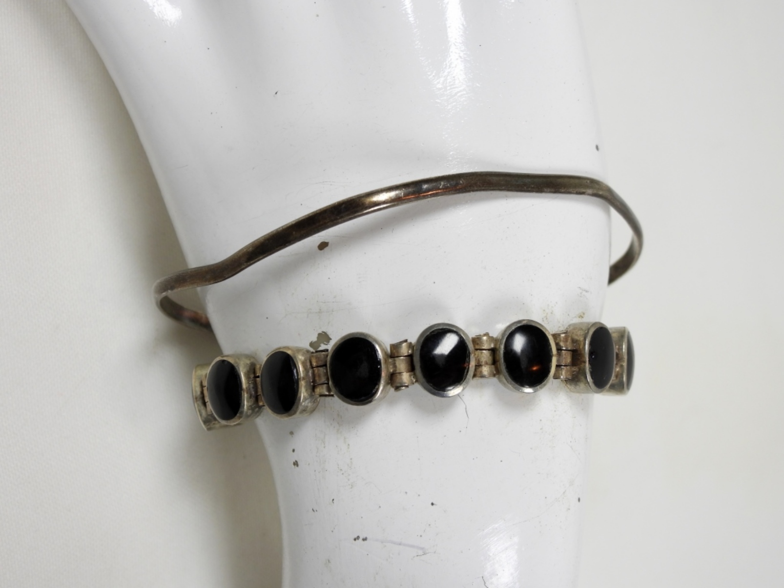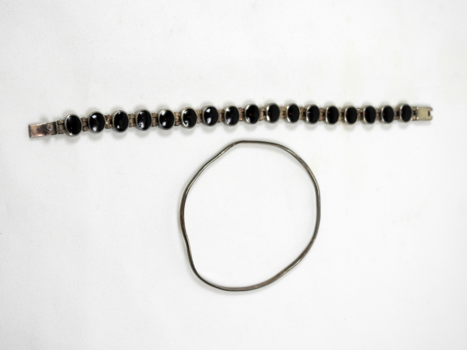 1 7.5” STERLING BLACK GEM STONE MEXICO SSTAMPED BRACELET AND 1 SLIDE ON STERLING MEXICO STAMPED BRACELET DWT (23.4)