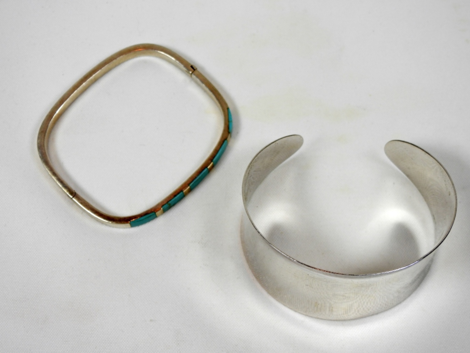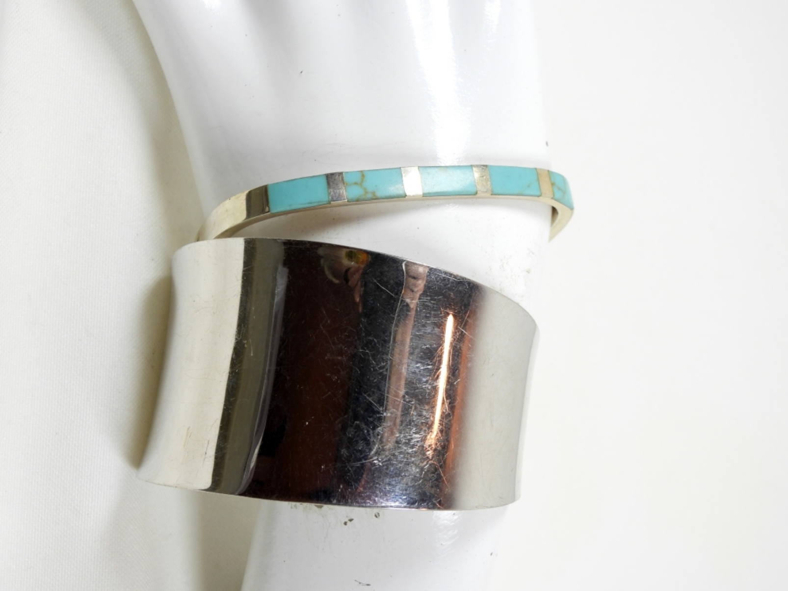 1 THICK PLAIN STERLING SLIDE ON BRACELET, 1 GREEN GEM STONE SLIDE ON BRACELET, DWT (30.4)