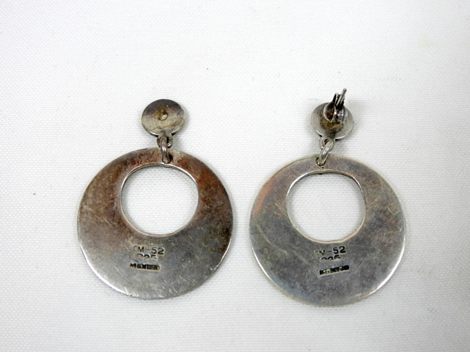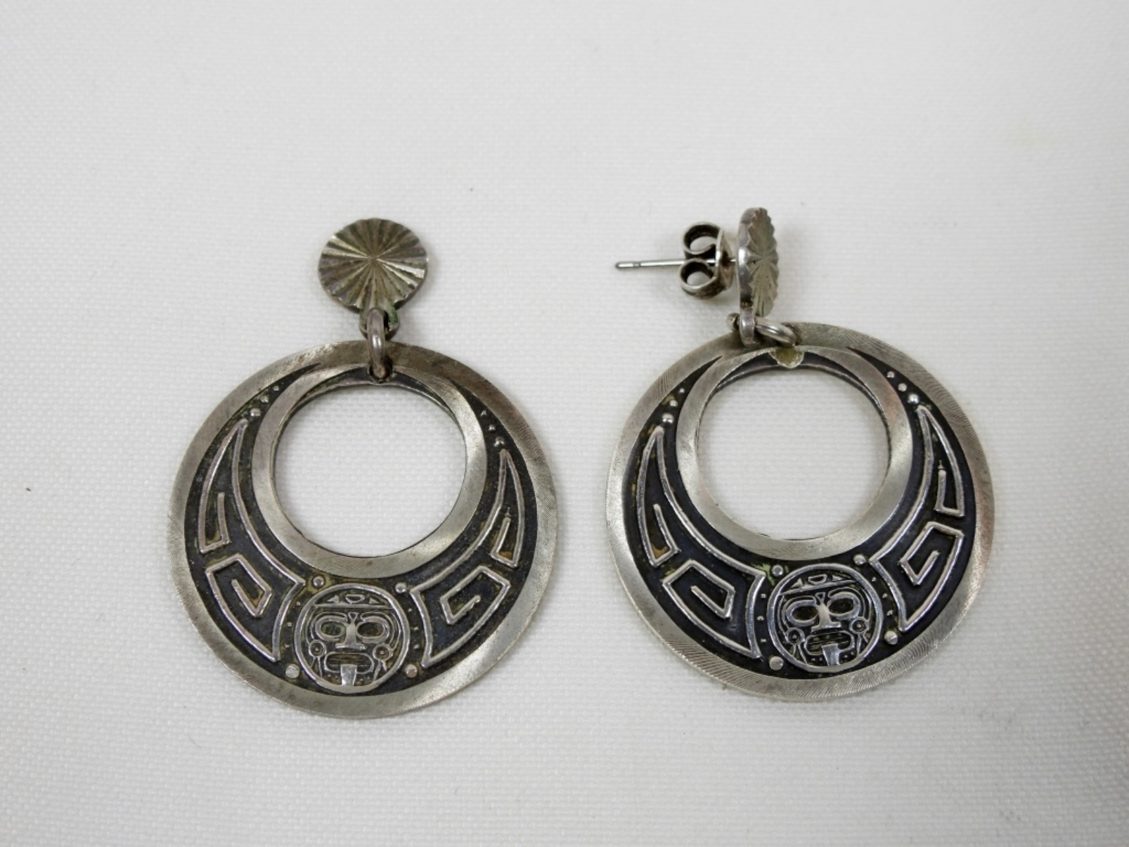 2 PIECE MEXICO STAMPED STERLING EARING SET, TRIBAL DESIGN, ONE EARING IS MISSING BACK HOOK, BROKEN/UP FOR REPAIR, SEE PHOTOS FOR DETAILS DWT (10.6)
