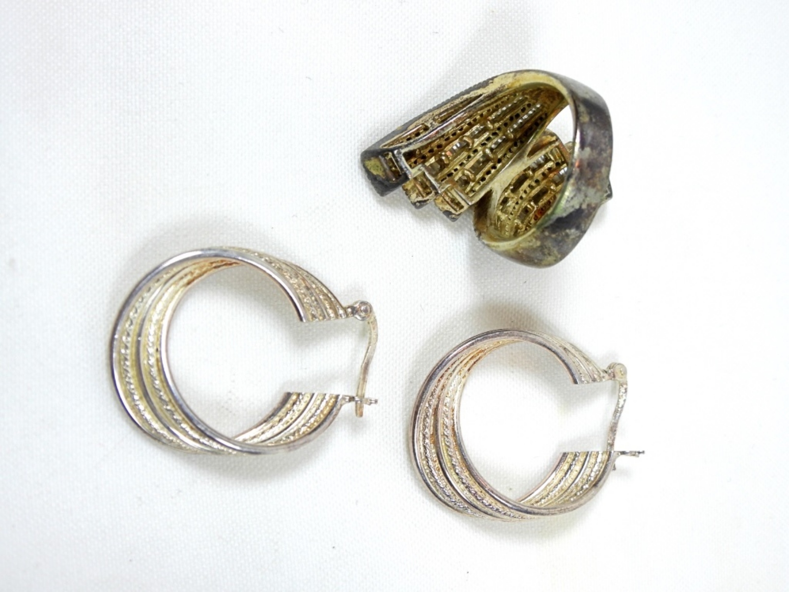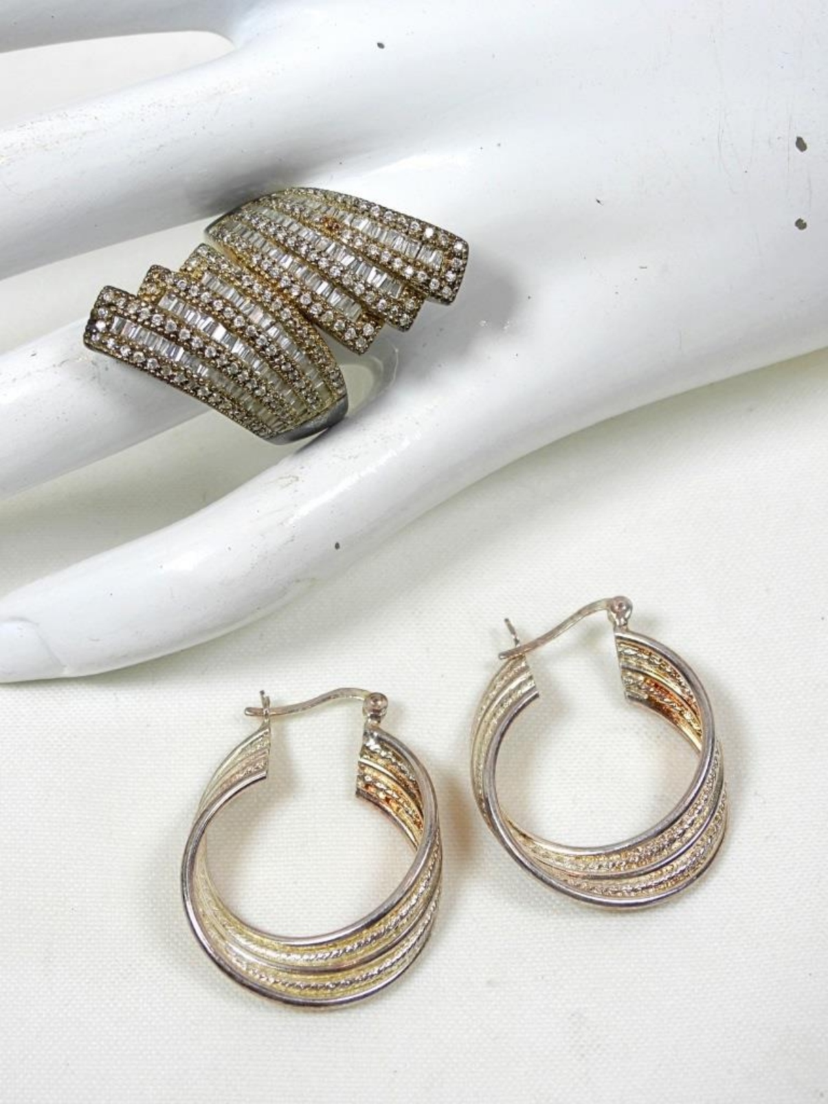 STERLING HOOP EARING SET, STERLING CLEAR CRYSTAL GEM RING SIZE 10, DWT (16.6)