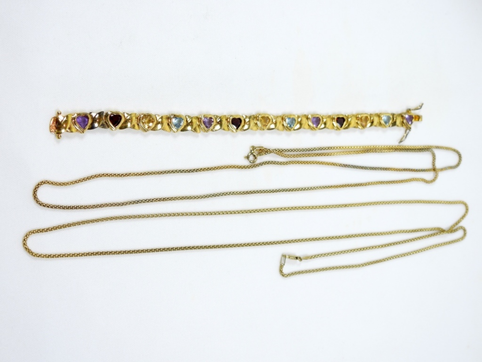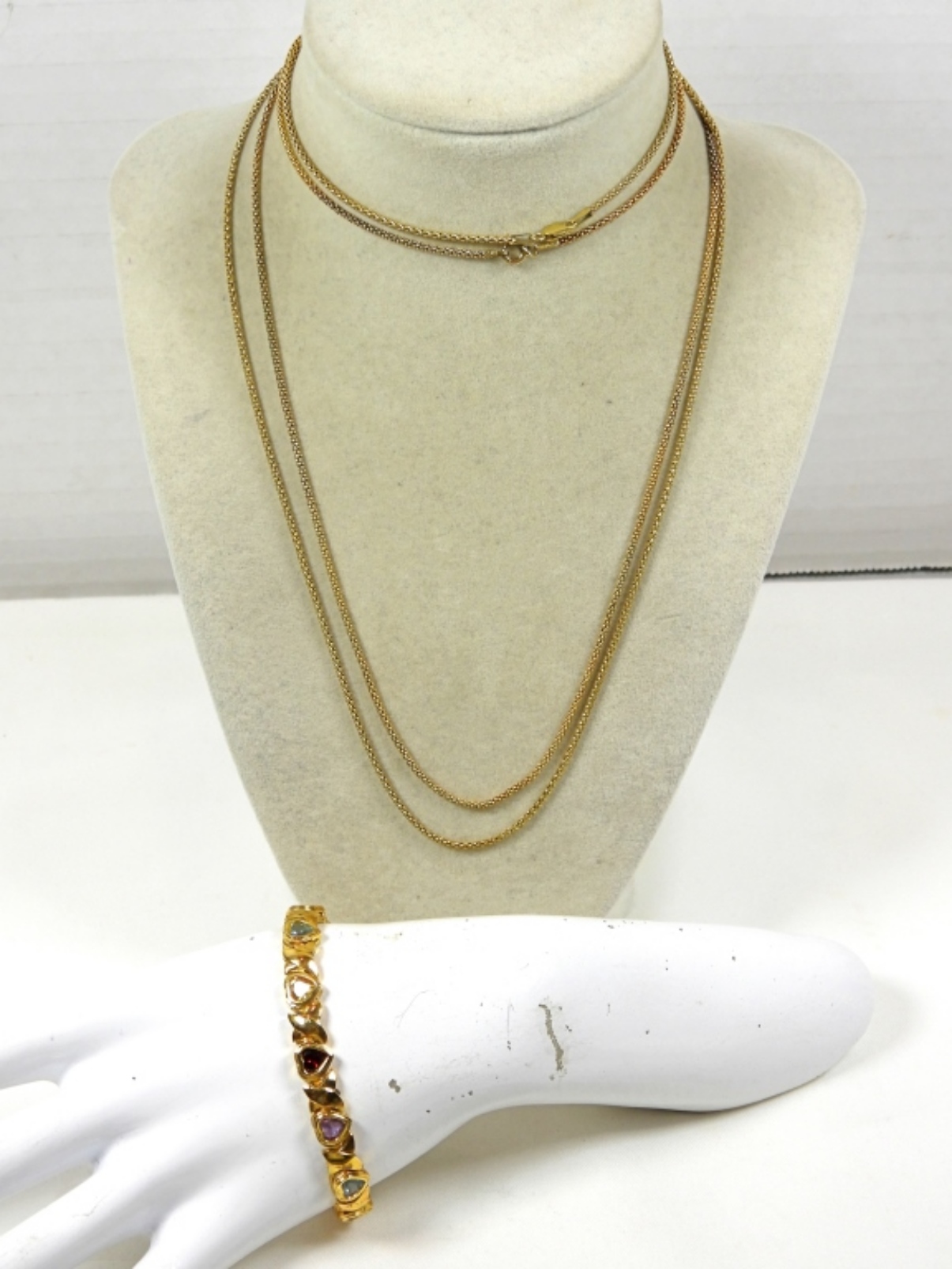 2 28” GOLD COLORED STERLING NECKLACES, 1 7.5” MULTICOLOR GEM STONE BRACELET, DWT (18.1)