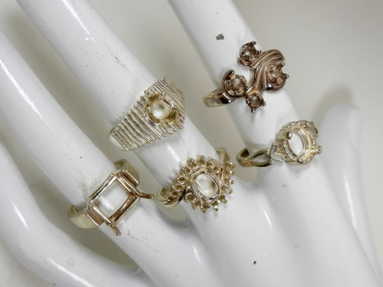 5 VARIETY STERLING RINGS WITH NO GEMS UP FOR REPAIR SIZES 6.5-7 DWT (10.8)